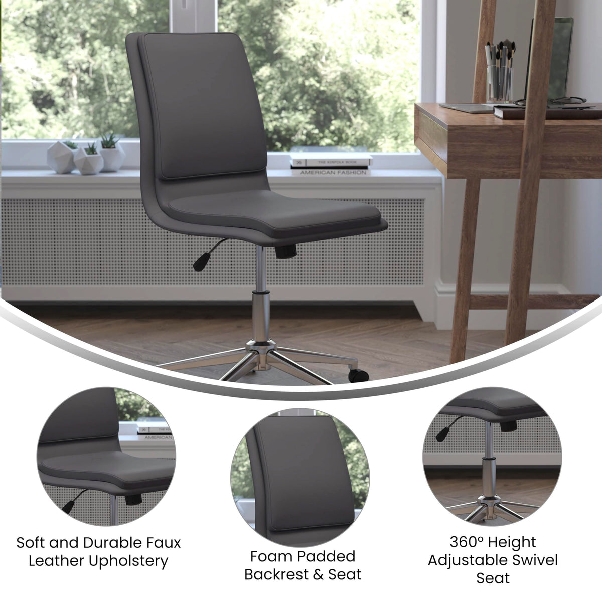Fabulous form meets practical purpose in the elevated style of this mid-back office task chair. Plush foam padding in the back and seat is enveloped in luxurious LeatherSoft upholstery for an upmarket look in a commercial workplace or home office. LeatherSoft is leather and polyurethane for added softness and durability. The space-saving, armless design allows this elegant chair to tuck beneath your desk or other workstation and lets you enter or exit from multiple angles. Premium materials and durable construction make this beautifully appointed swivel chair a must have for daily use. A solid wood seat and 5-star chrome base give a worry-free seating experience and hold up to 300 lbs. static weight capacity while the 360 swivel feature, along with dual wheel casters, provides excellent mobility to reach multiple work surfaces. Pneumatic seat height adjustment puts you at the perfect level to keep your feet flat on the floor for correct posture. Super easy assembly will have your new chair ready to go in under 10 minutes and a solvent-based cleaner will keep it looking brand new with no water needed. This swivel task chair is available in multiple colors to match any decor.