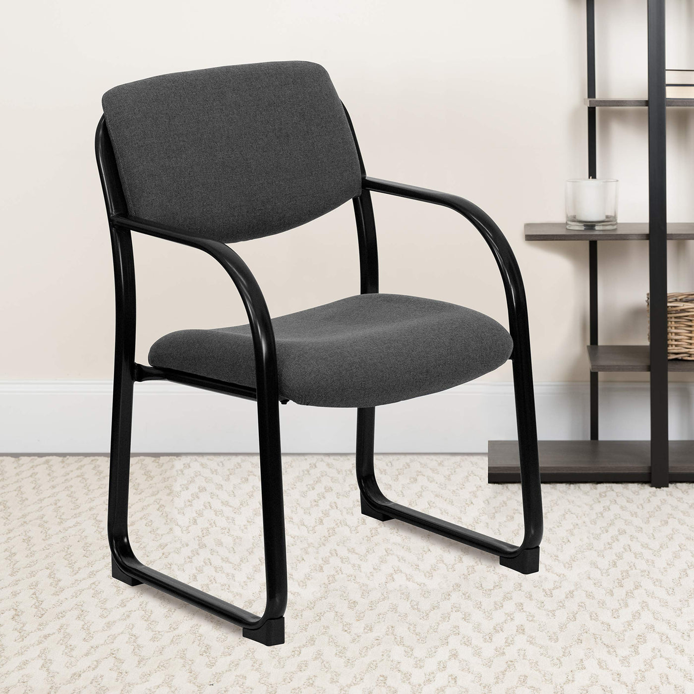 Add refined style to your reception waiting room or inner office with this gray, fabric upholstered executive side reception chair. Featuring contoured cushions and curved arms to relieve stress on the neck and shoulders, this chair will provide supreme comfort for clients and guests. The stabilizing sled base is a great choice on carpeted floors because the legs won't snag. The open back design paired with the sled base frame in a black powder coated frame finish give this side chair an elegant, understated quality that will be noticed.
