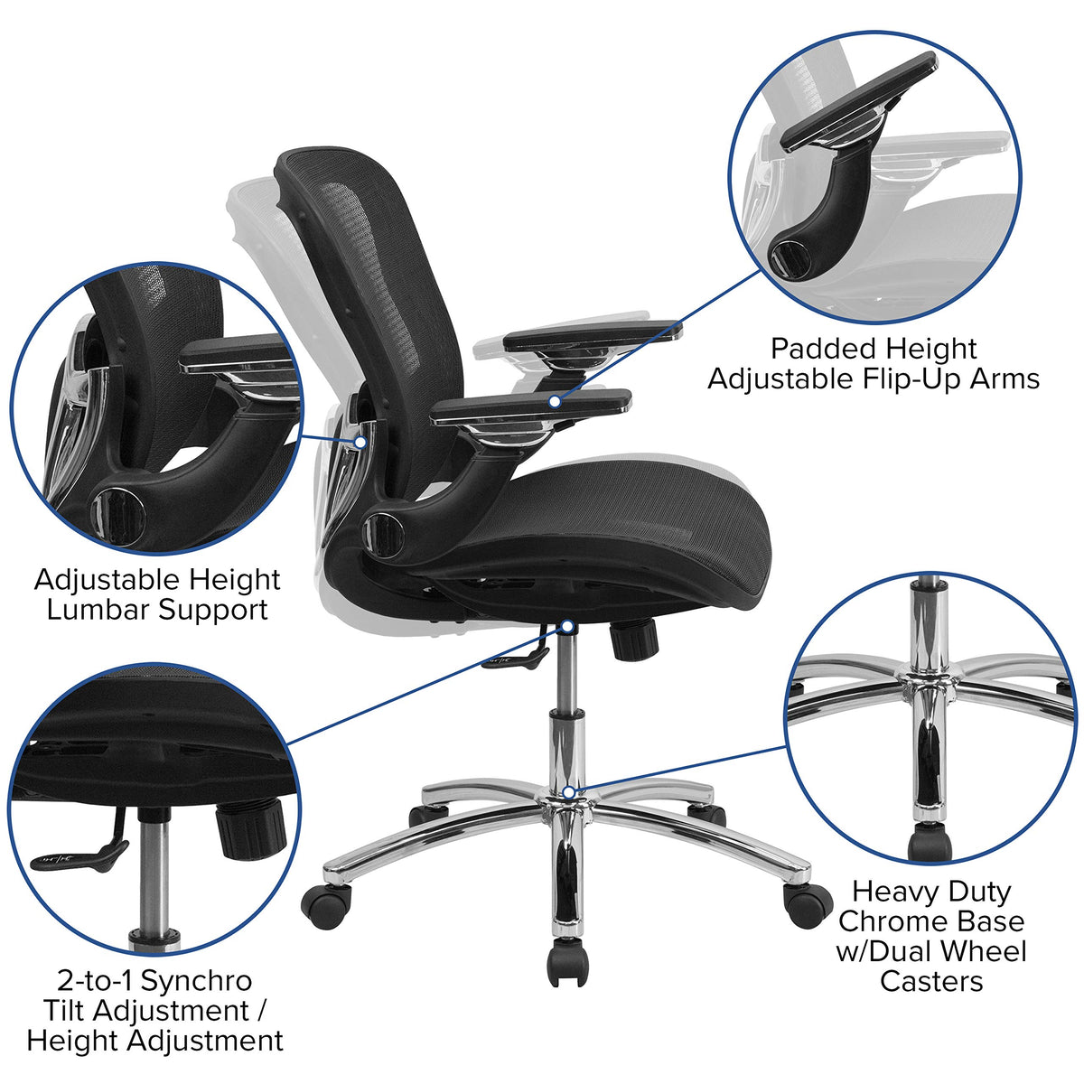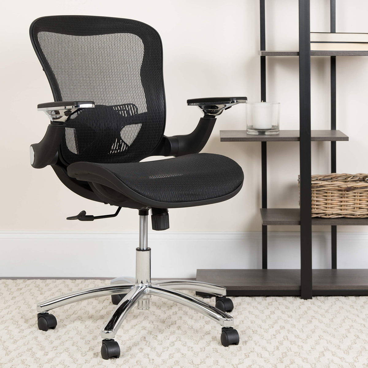 This innovative, black mesh, executive swivel office chair provides exceptional support to the hard-working professionals in your office. The transparent black mesh back allows air to circulate, keeping you cool no matter how high the pressure gets. The swivel seat is also transparent to keep you cool in both directions. Its waterfall edge is designed to relieve pressure to your legs and promote healthy blood flow. Height adjustable flip-up arms take pressure off your shoulders and neck, and give you the option to flip them up and out of your way. You can adjust the height of the seat back for maximum lumbar support and easily raise or lower the seat using the pneumatic seat height adjustment lever. Whether it's a day filled with meetings or you're working to beat a tight deadline, this stylish chair will keep you cool and comfortable throughout your busy day.