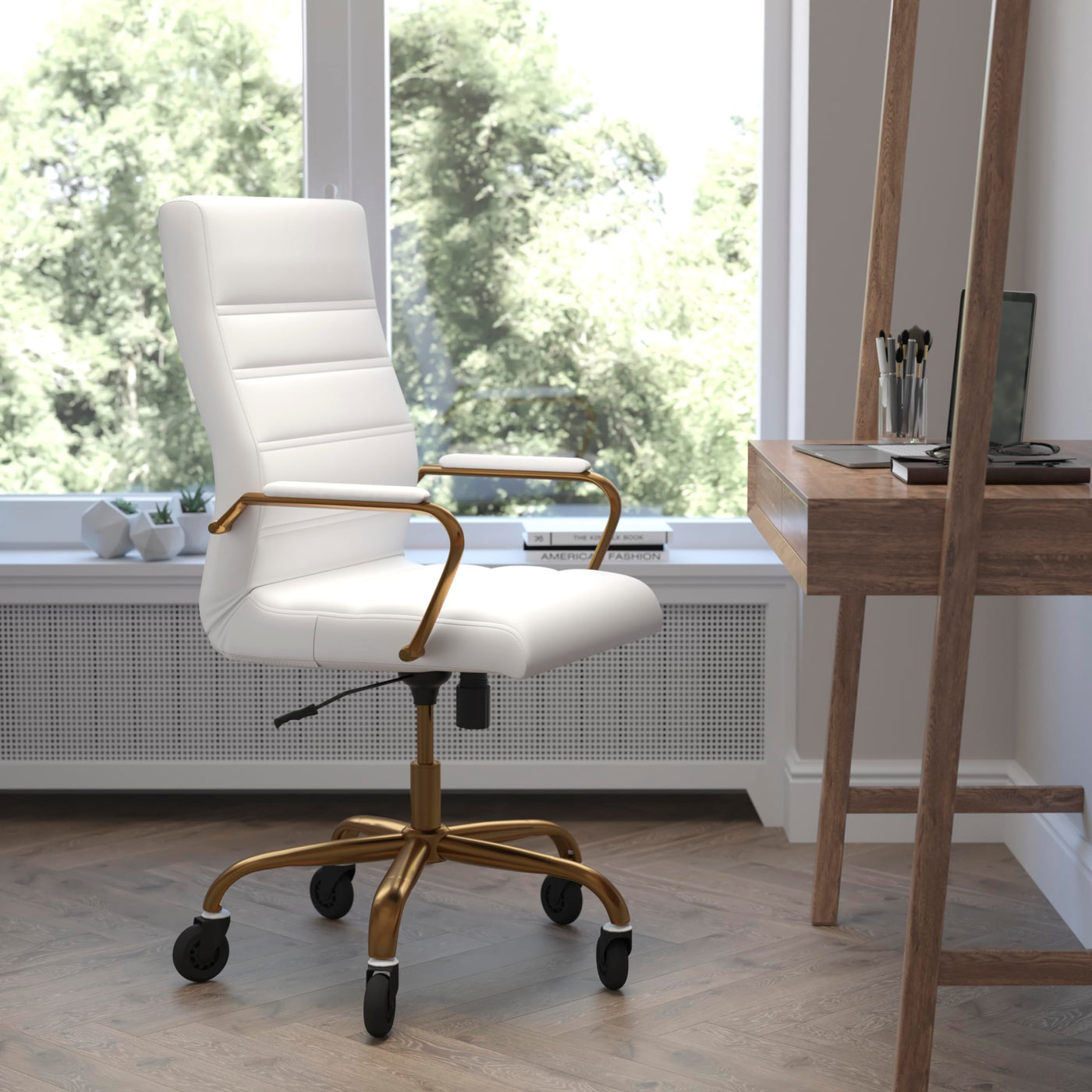 Comfort and style abound in this high-back LeatherSoft office chair with a contrasting gold frame and updated ball-bearing roller style wheels making it the perfect seating solution for your workspace. Crafted from premium materials, the ergonomic design brings a sleek look with ample durability and support for long-term use. Designed for exceptional comfort, this computer desk chair features a LeatherSoft upholstered, cushioned seat and back with padded arms for additional comfort. Horizontal stitching along the seat and back adds a touch of refinement that appeals in any space. The high-back office chair features extended height to support your upper back and help relieve back tension. A waterfall front seat edge removes pressure on your lower legs. Complete your custom fit with the pneumatic seat height adjustment lever and a tilt-lock mechanism for a rocking and reclining motion. Easily maneuver through a variety of tasks with the full 360-degree swivel seat atop transparent polyurethane roller style wheels with smooth ball-bearing motion. The classic styling pairs effortlessly with any office decor style, creating a comfortable and elegant impression that's perfect for residential or corporate workspaces.