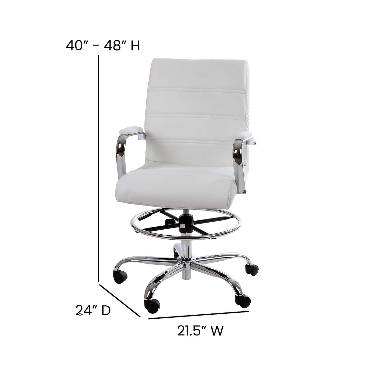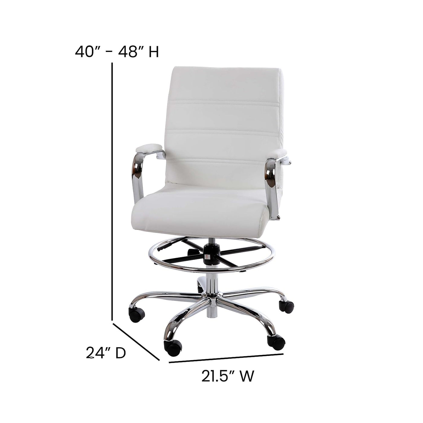 Amplify any office or workspace with the comfort and modern style of the Flash Furniture Whitney LeatherSoft Drafting Chair. This mid-back LeatherSoft swivel office chair adds stylish, comfortable seating to any work area to help busy workers or students achieve maximum comfort day after day while performing their work duties. Not only does this swivel desk chair work great for offices, it also thrives in nail salons, car shops, retail stores, at-home work desks, college dorm rooms, or student study spaces. It boasts a soft and durable mid-back white LeatherSoft back and seat paired with a sleek metal base and armrests to effortlessly boost your desk or work area with modern style. The ergonomic mid-back design with a thickly padded waterfall front seat, padded armrests, and adjustable supportive foot ring allows each employee to take on long work days without discomfort. Additionally, the highly customizable chair features a pneumatic height adjustable 360-degreee swivel seat for easy maneuverability to create a comfortable, custom seating experience. This stylish office chair measures 21.5"W x 24"D x 40-48"H and can be assembled quickly with the included tools and step-by-step instructions, and it wipes clean with a damp cloth for easy cleaning.