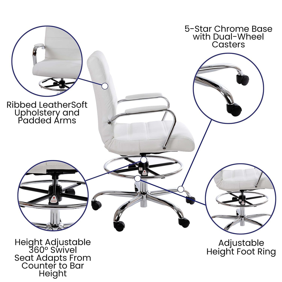 Flash Furniture Whitney Mid-Back Swivel LeatherSoft Drafting Chair with Padded Seat, Armrests, and Foot Ring, Adjustable Office Chair, White/Chrome