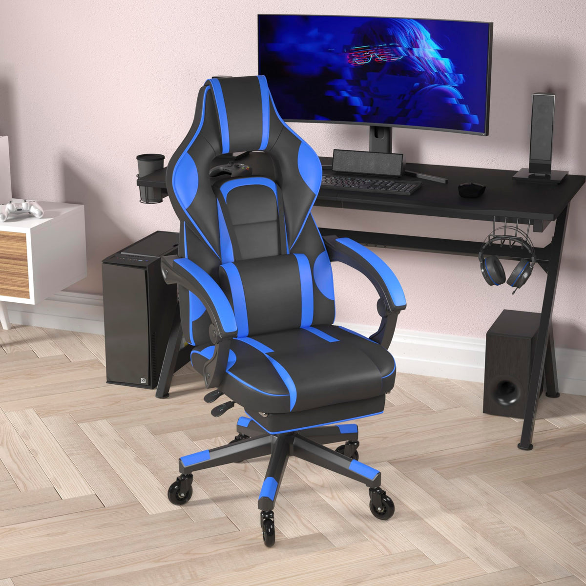 Flash Furniture X40 Gaming Chair Racing Computer Chair With Fully Reclining Back/Arms And Transparent Roller Wheels, Slide-Out Footrest, - Black/Blue