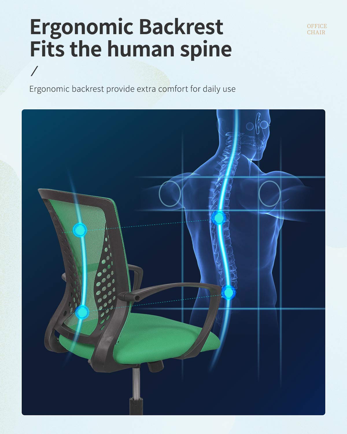 Home Office Chair Mid Back Pc Swivel Lumbar Support Adjustable Desk Task Computer Ergonomic Comfortable Mesh Chair With Armrest (Green)