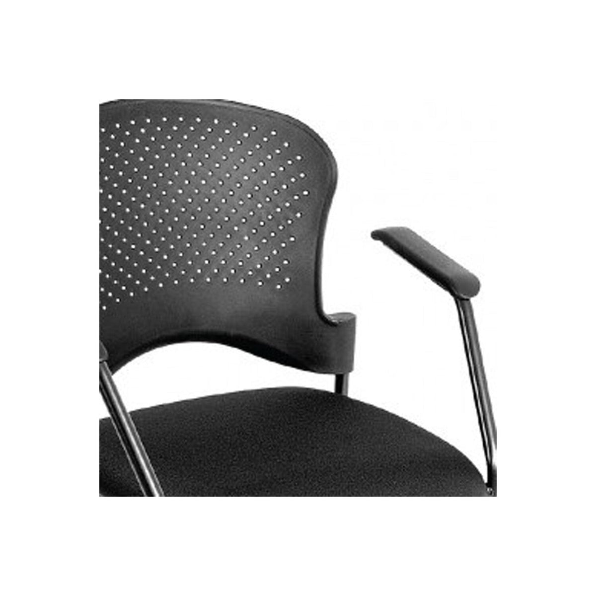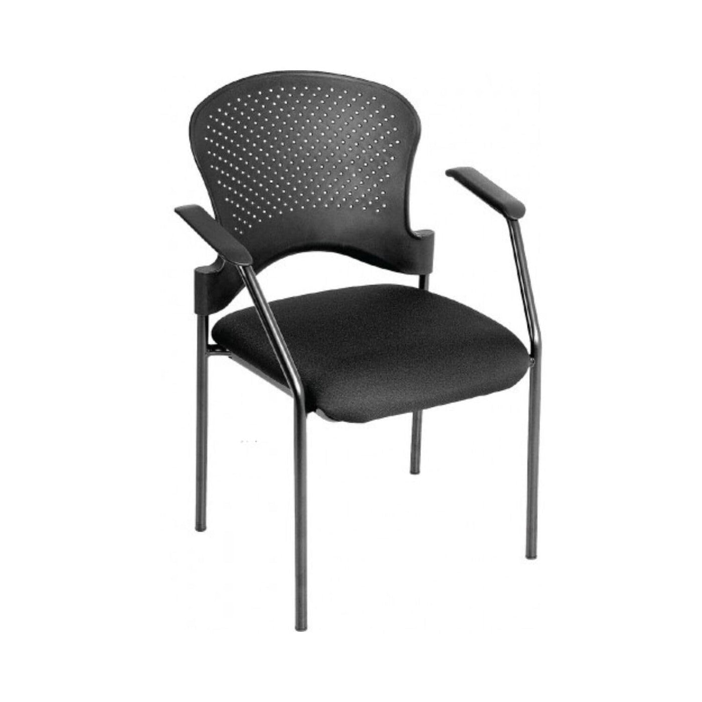 A solid black frame chair for your office and working space. You get the very definition of comfort with its aerated plastic back and well padded seat, which is upholstered in soft black fabric. The chair is supported by four legs with plastic insert to keep your floor scratch free. Go ahead and sit with confidence while you get the job done. Its black finish gives your space a professional lift. Dimensions: 25" x 21" x 33.75".