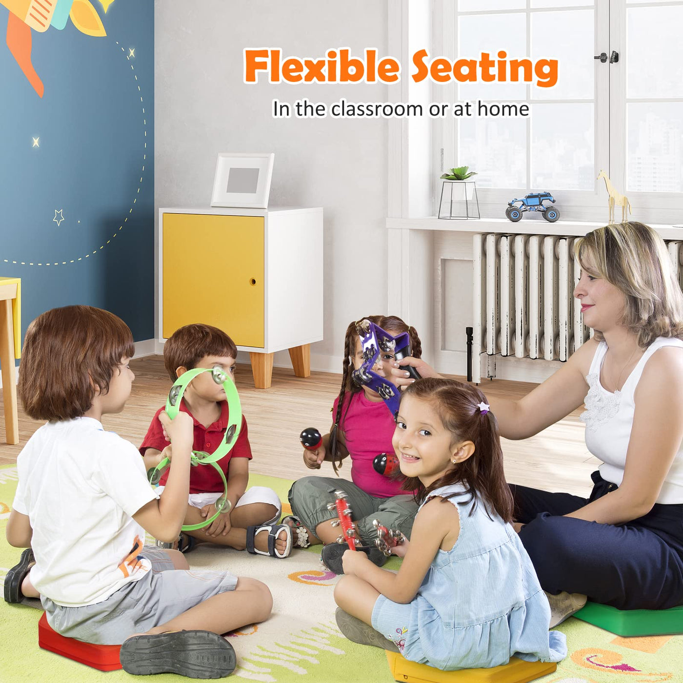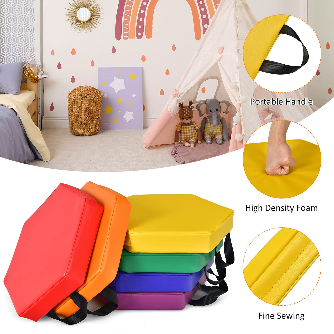 Description: Are you looking for 6-piece seat cushions for your kids? Consider our multi-color foam seat set. Made of non-toxic and high-quality PU and EPE materials, our high-density cushions are durable and have long service time. In addition, the seat set is waterproof, which makes cleaning process and maintenance convenient. And light weight design and handy handle allow kids to carry at will.If you’re looking for a seat set like this, please don’t miss it! Our 6-piece seat cushions are helpful for kids to identify colors, exercise cognitive ability and stimulate creativity. Feature: Light weight for free arrangement and easy carrying process Soft surface can protect your children fromgetting hurt Comfortable EPE and wearable PU coverensure long service life Precision stitches make mats wear-resistant Built-in zipper makes cover and foamremovable easily Colorful cushions for the development ofcolor recognition Diverse arrangement choices fordifferent using requirements Widely used in various situations likekindergartens, homes and daycares ASTM certification ensuresquality andlong-time service life Specification: Color: Assorted Material: PU + EPE Diameter: 15” Width of Cushion: 3'' Cushion Number: 6 Individual Weight: 0.9 lbs Overall Weight: 6.8 lbs Certification: ASTM Package includes: 6 x Round Cushions