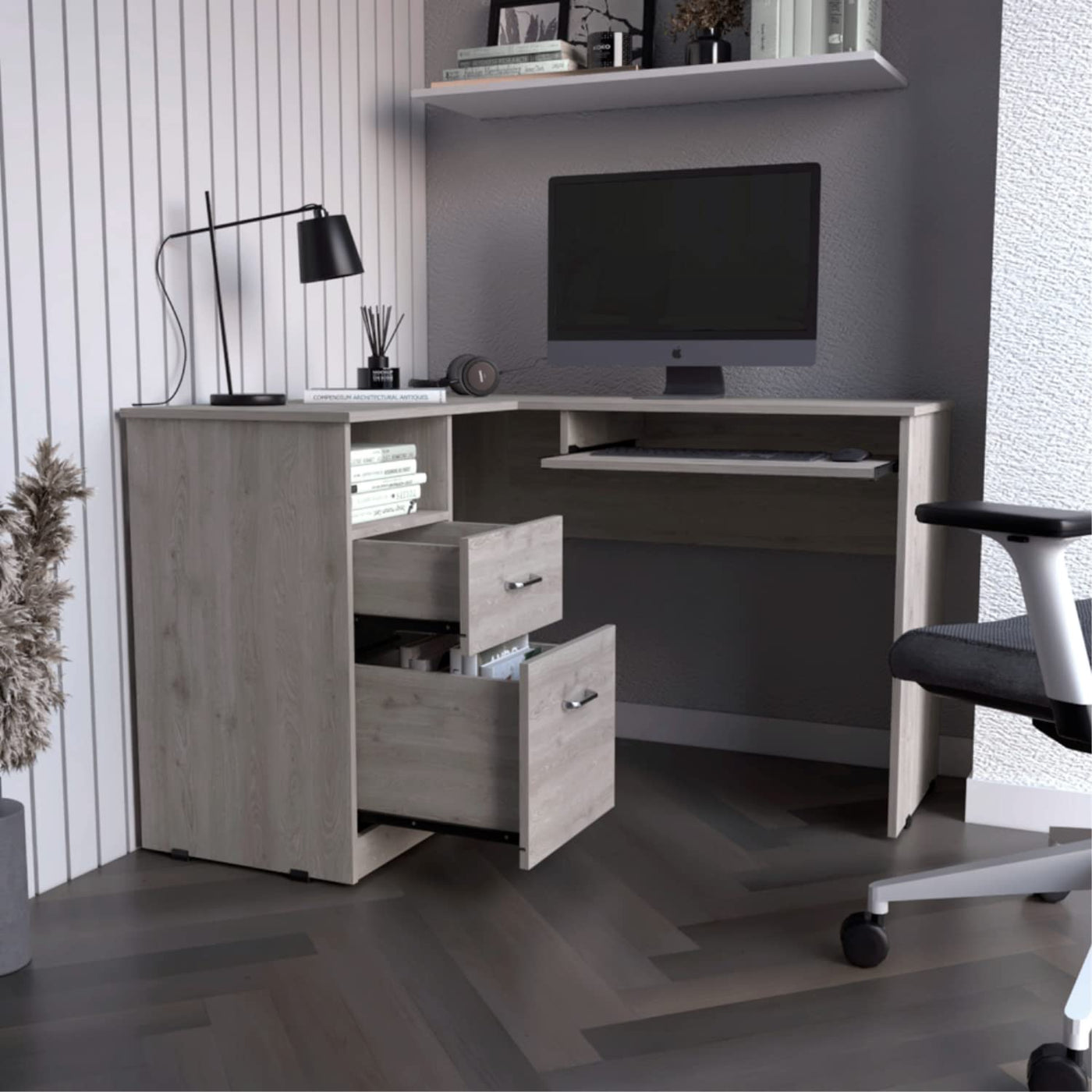 Idra L-Shaped Desk with Keyboard Tray, 2 Drawers, and Open Shelf, Light Gray