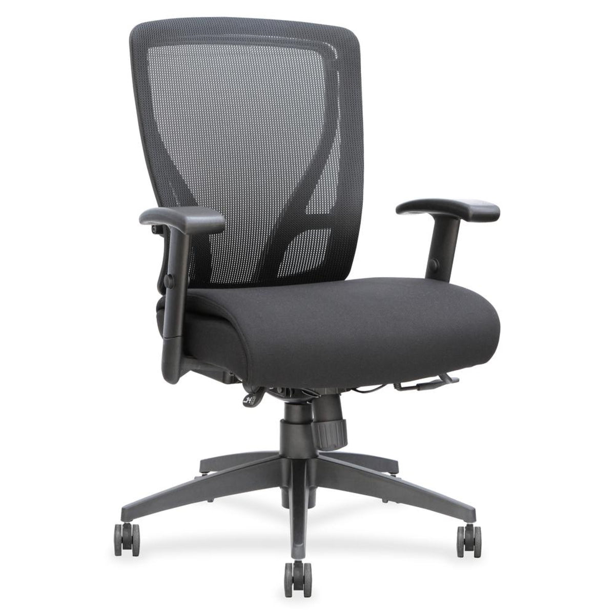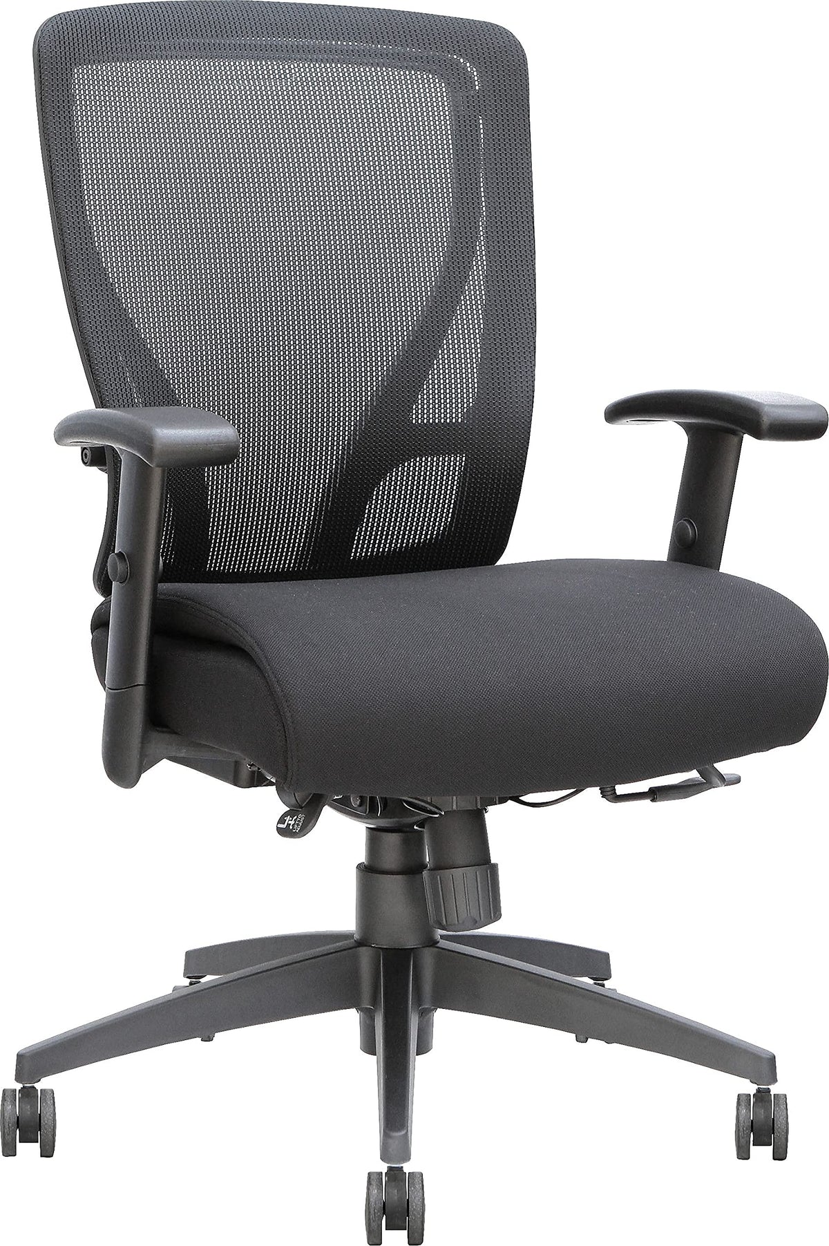 Mid-back chair features a sophisticated cable control mechanism to control the many chair comfort functions. Synchro tilt offers five locking positions. Seat-glide mechanism allows the seat cushion to travel forward and back and then lock into position. Other functions include pneumatic seat-height adjustment, seat-depth adjustment, 360-degree swivel, tilt tension and tilt lock. Arms adjust in height from 18-1/4" x 21-7/8" and are padded with polyurethane. Back is covered in mesh for flexible and breathable reclining while the thickly cushioned seat is upholstered in fabric. 27-1/6" diameter spider nylon base is equipped with 60mm casters for easy chair movement. Weight capacity is 250 lb. Seat measures 20" wide x 17-3/8" deep. Back dimensions are 18-7/8" wide x 22-5/6" high.