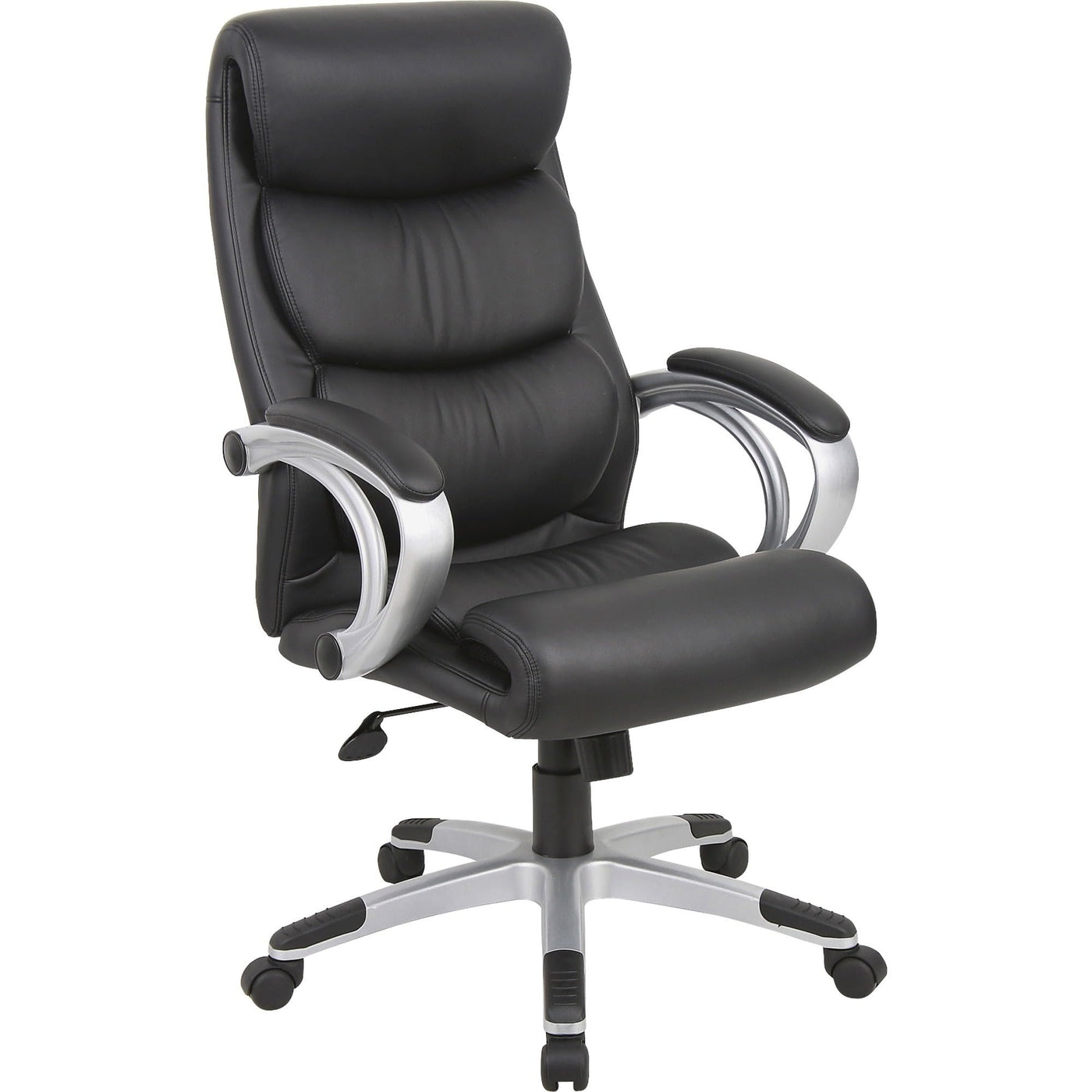 High-back executive chair features bonded leather upholstery. Arms are also padded for comfort. Arms and five-star base are powder-coated for durability. Base is equipped with casters for easy mobility. Functions include pneumatic seat-height adjustment, 360-degree swivel, tilt, tilt tension and tilt lock.
