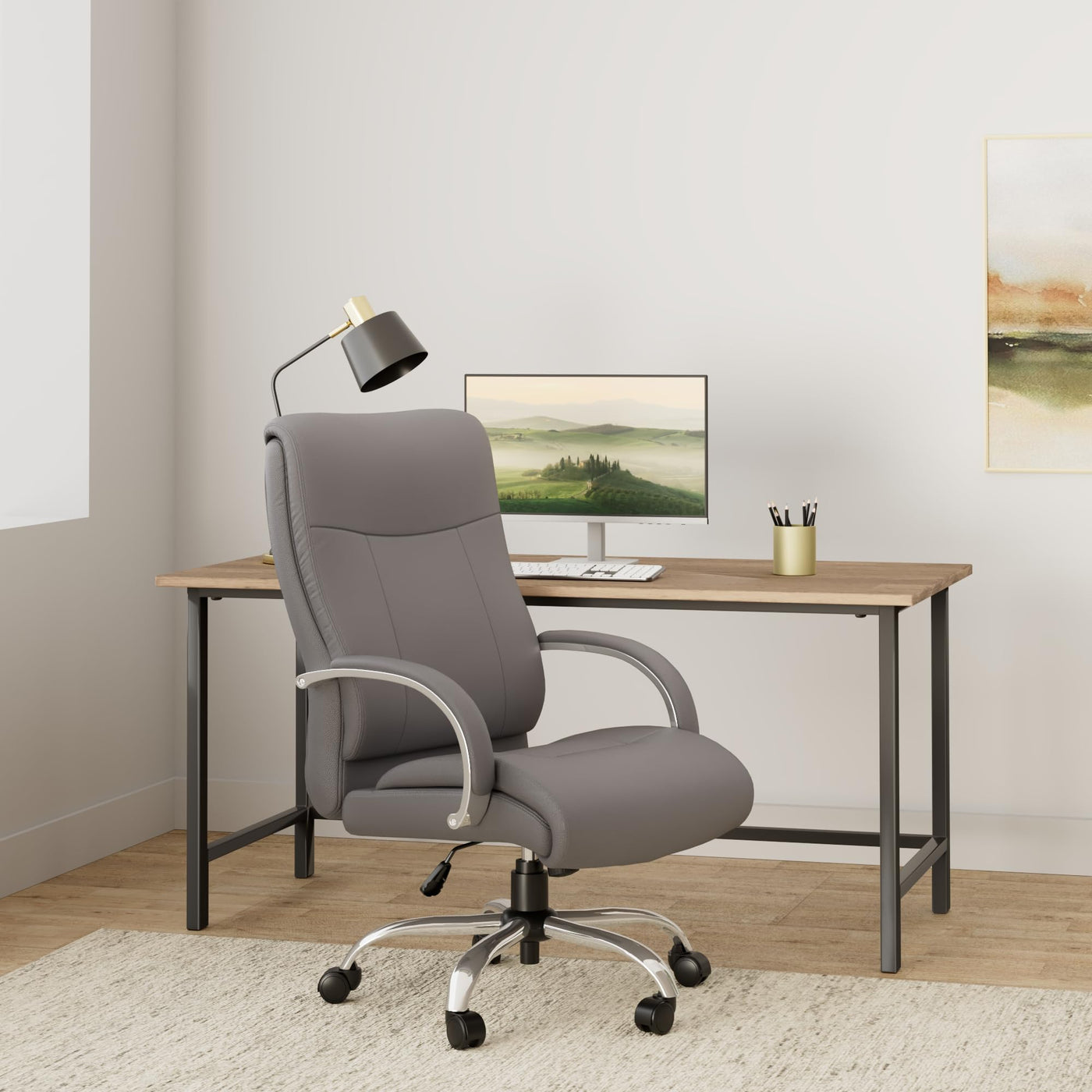 Deluxe Big and Tall Chair supports weight up to 450 lb. and offers the bonded leather upholstery on the thickly cushioned seat and back. Chromed steel arms have soft pads to rest your arms. The 29" diameter five-star base is made of shiny chromed steel for durability and is equipped with casters for easy mobility. Comfort features include pneumatic seat-height adjustment, 360-degree swivel, normal tilt with lock and tilt tension adjustment.