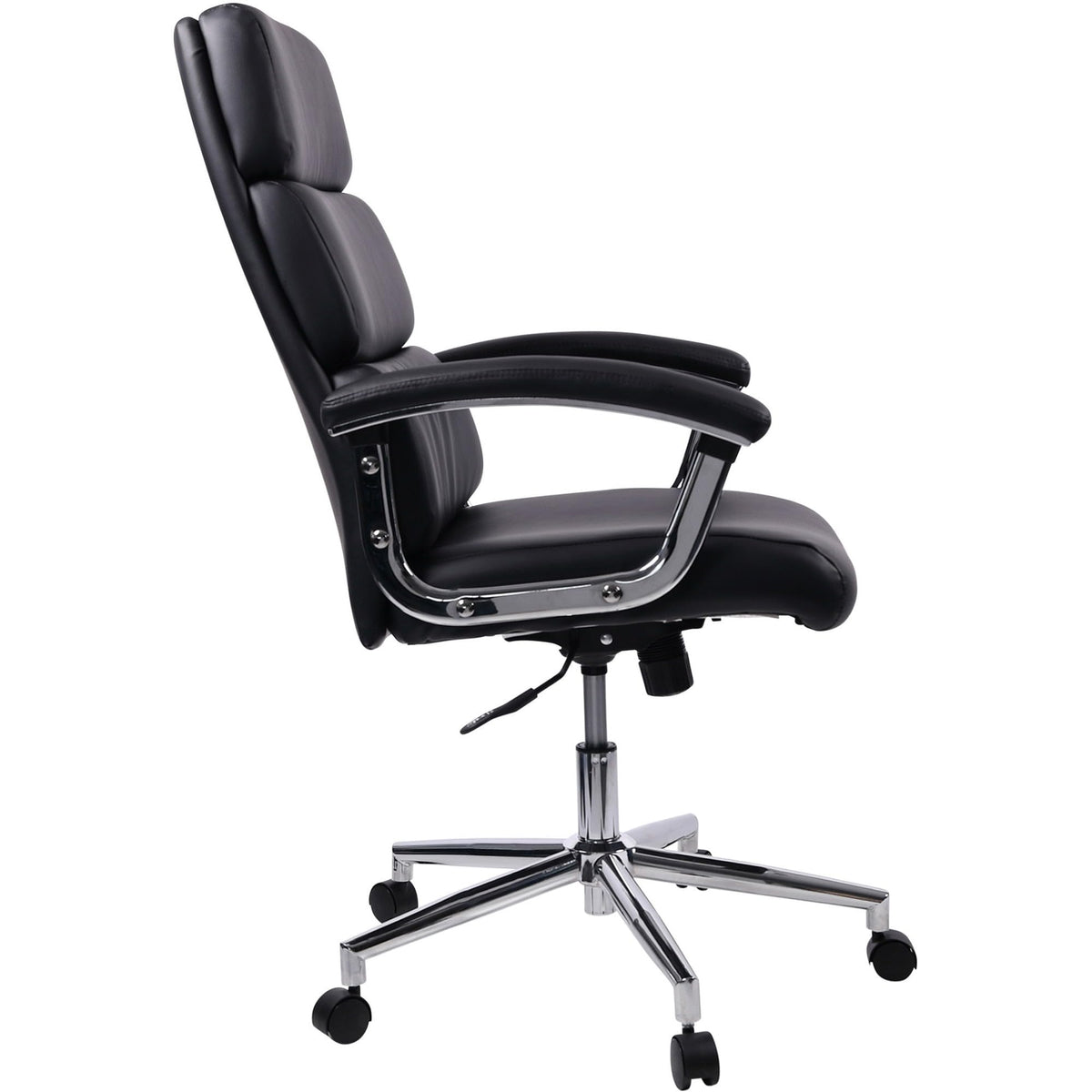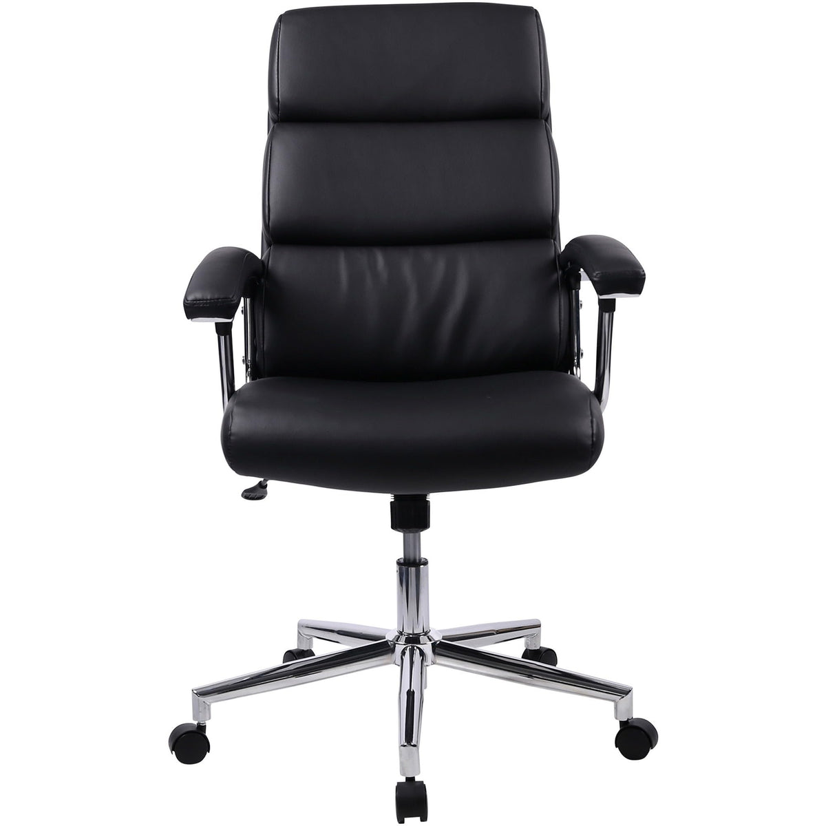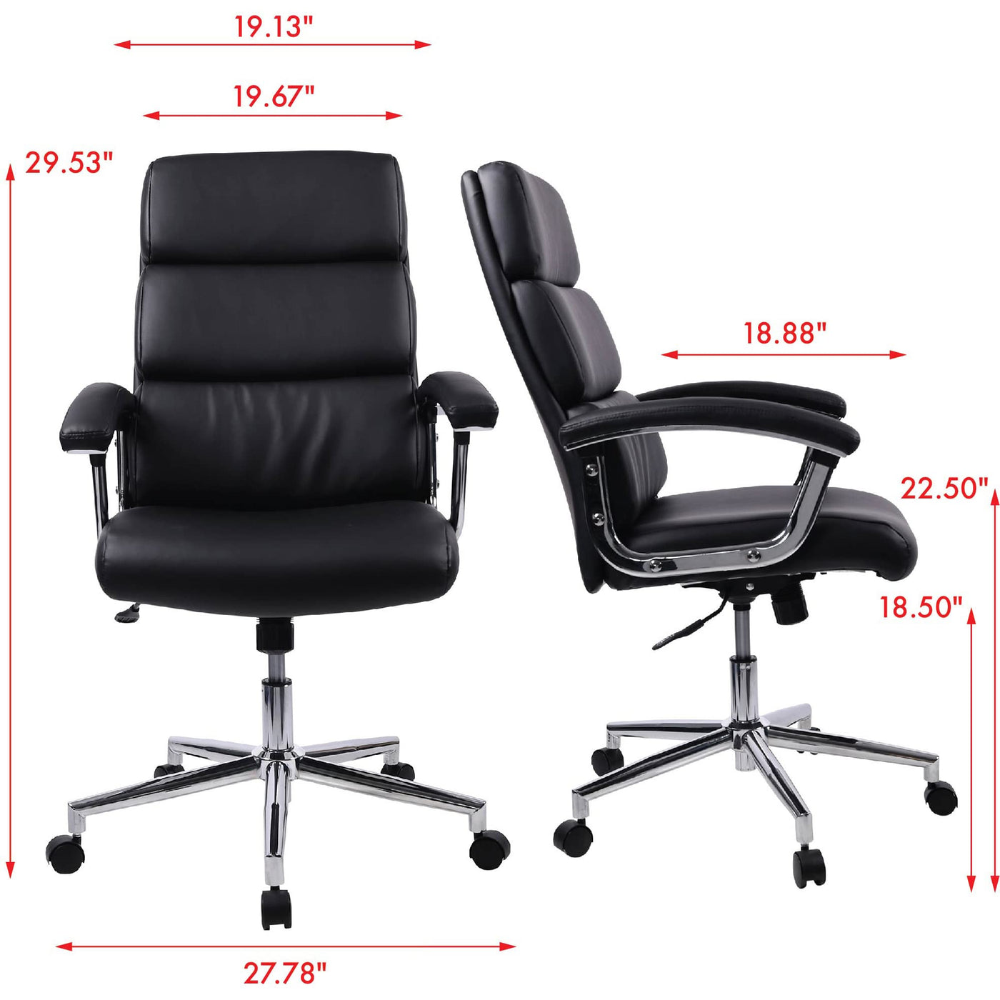 High-back chair features bonded leather upholstery over thickly cushioned seating for deluxe comfort and style. Fixed chrome steel arms also feature soft upholstery pads. Functions include pneumatic seat-height adjustment from 18-1/2" to 22-1/2", 360-degree swivel, tilt, tilt tension and tilt lock. 27-7/9" diameter spider base is made of steel with a shiny chrome finish and is equipped with 50mm hooded, dual-wheel casters for easy chair movement. Weight capacity is 250 lb. Seat measures 19-1/8" wide x 18-7/8" deep. Back dimensions are 19-2/3" wide x 29-8/15" high.