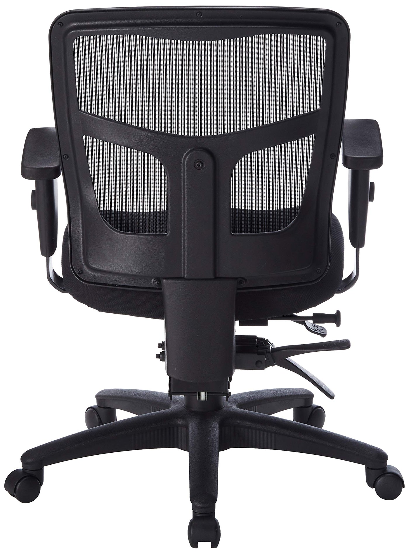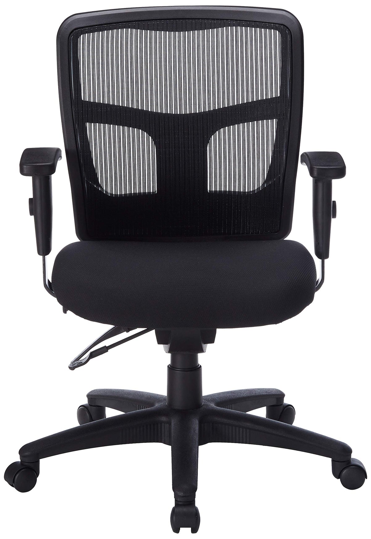 Managerial mid-back chair features a breathable mesh back chair, fabric seat and ratchet back to enhance your comfort. Mesh is made of high-strength elastic nylon. Ergonomically designed mid-back matches the natural curvature of a person's back. Seat and back angle can be adjusted and locked independently. Arms adjust in height (25-3/5" to 29") and in width (24" to 26"). Functions include pneumatic seat-height adjustment (18" to 21-2/3" high from the floor), 360-degree swivel, seat slider for seat depth adjustment, tilt and asynchronous three-lever control. Black frame has five-star, reinforced nylon base (26" diameter) with casters for easy mobility. Seat size is 20" wide x 18-7/10" depth. Back measures 20" wide (at the widest portion) x 19-7/10" high. Weight capacity is 250 lb. Chair meets the CA117 fire-retardant standard and BIFMA standards.