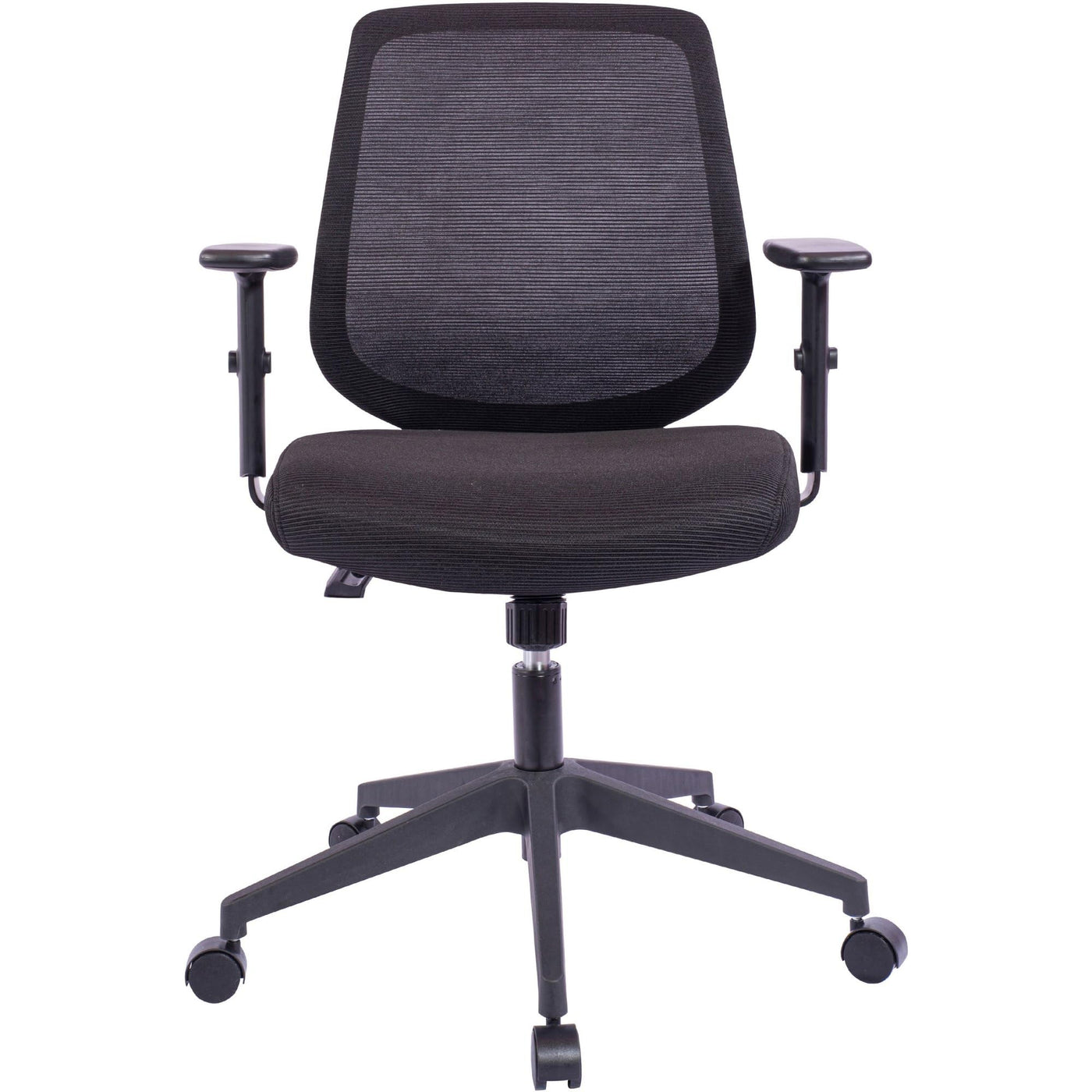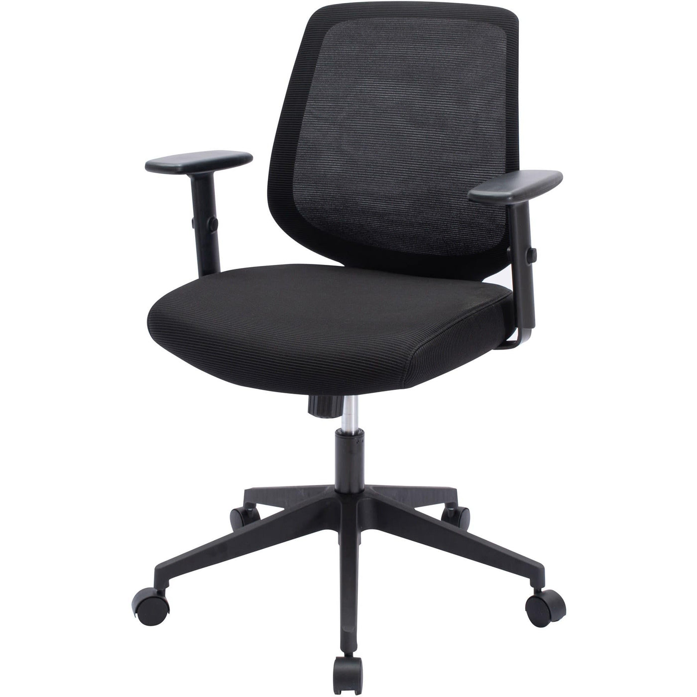 Mid-Back Task Chair features a tight, breathable mesh on the back for reliable support. Cushioned seat is upholstered in matching fabric for a continuous look. Padded arms adjust in height. Functions include adjustable seat height from 18-1/2" to 22", 360-degree swivel, tilt tension adjustment and tilt/tilt lock. The 12-3/5" diameter, five-star nylon base is equipped with dual-wheel casters for easy movement. Seat measures 50-1/2" wide x 17-1/2" deep. Back size is 18-1/2" wide x 17-5/7" high. Weight capacity is 275 lb.