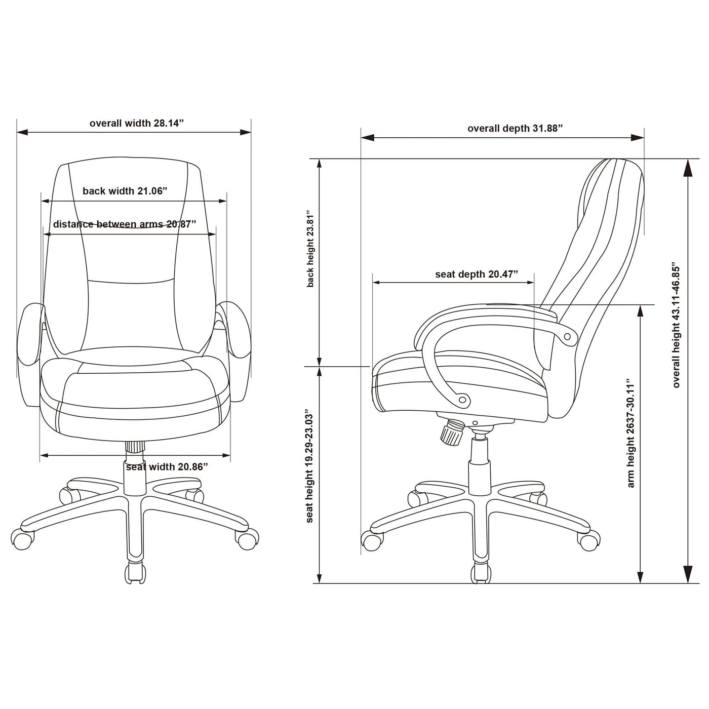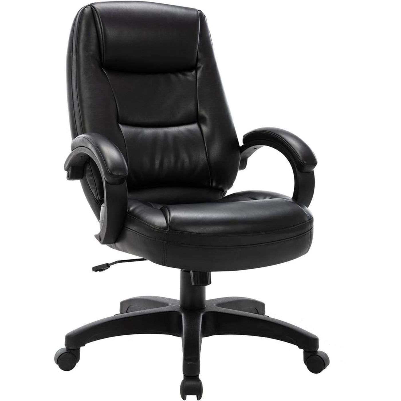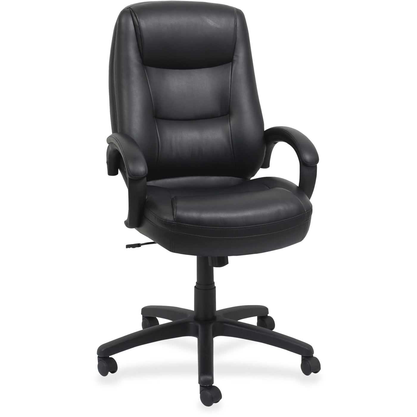 Executive high-back chair, part of the Lorell Westlake Series, features bonded leather upholstery with overstuffed cushions, a waterfall seat and padded arms for exceptional comfort. Functions include pneumatic seat-height adjustment from 18-1/4" to 21-3/4", 360-degree swivel, tilt, tilt tension, and tilt lock. Overall chair height adjusts from 43" to 46-1/2". Polyurethane frame offers a black powder-coat finish. High-back chair meets or exceeds applicable ANSI/BIFMA standards and meets the CA117 fire-retardant standard.