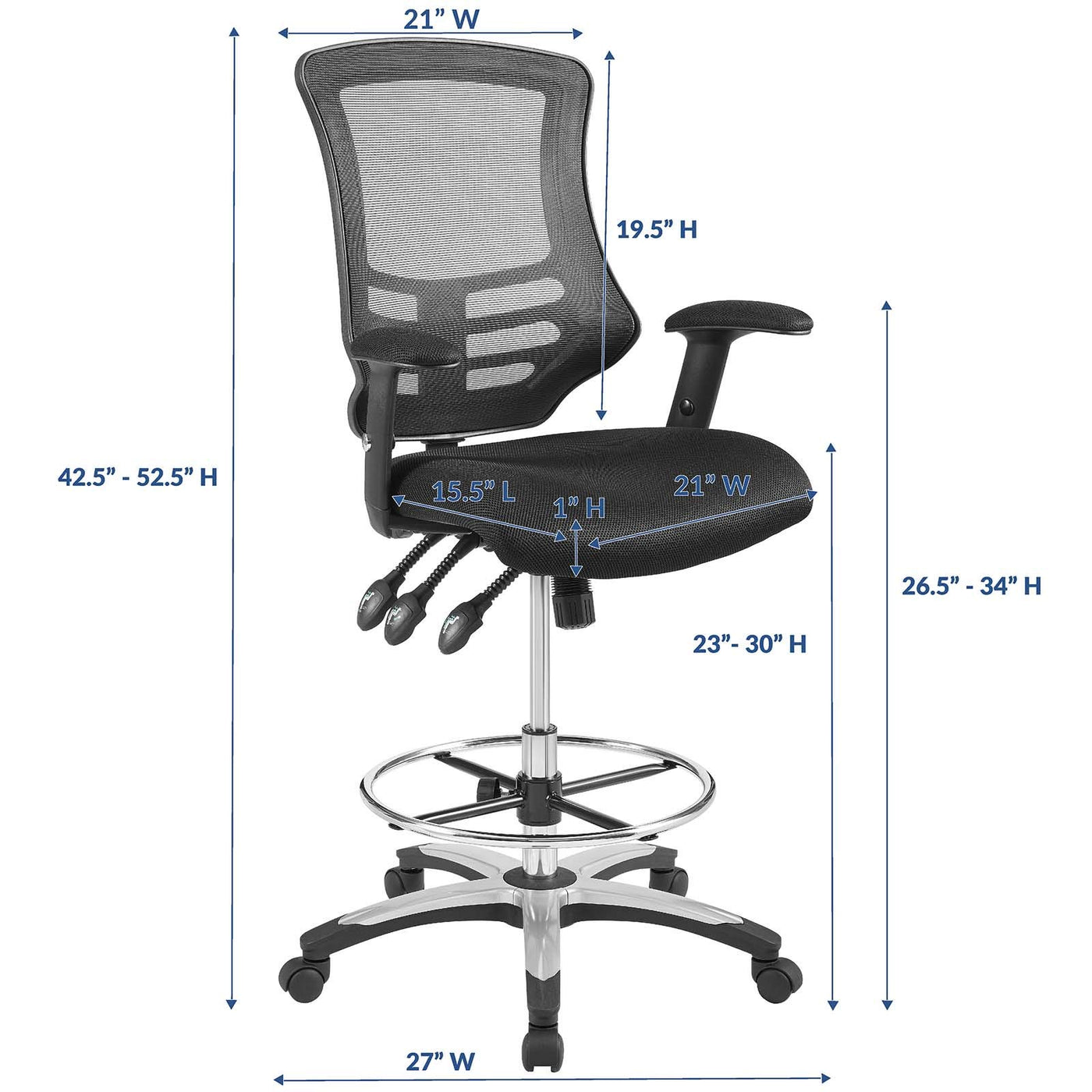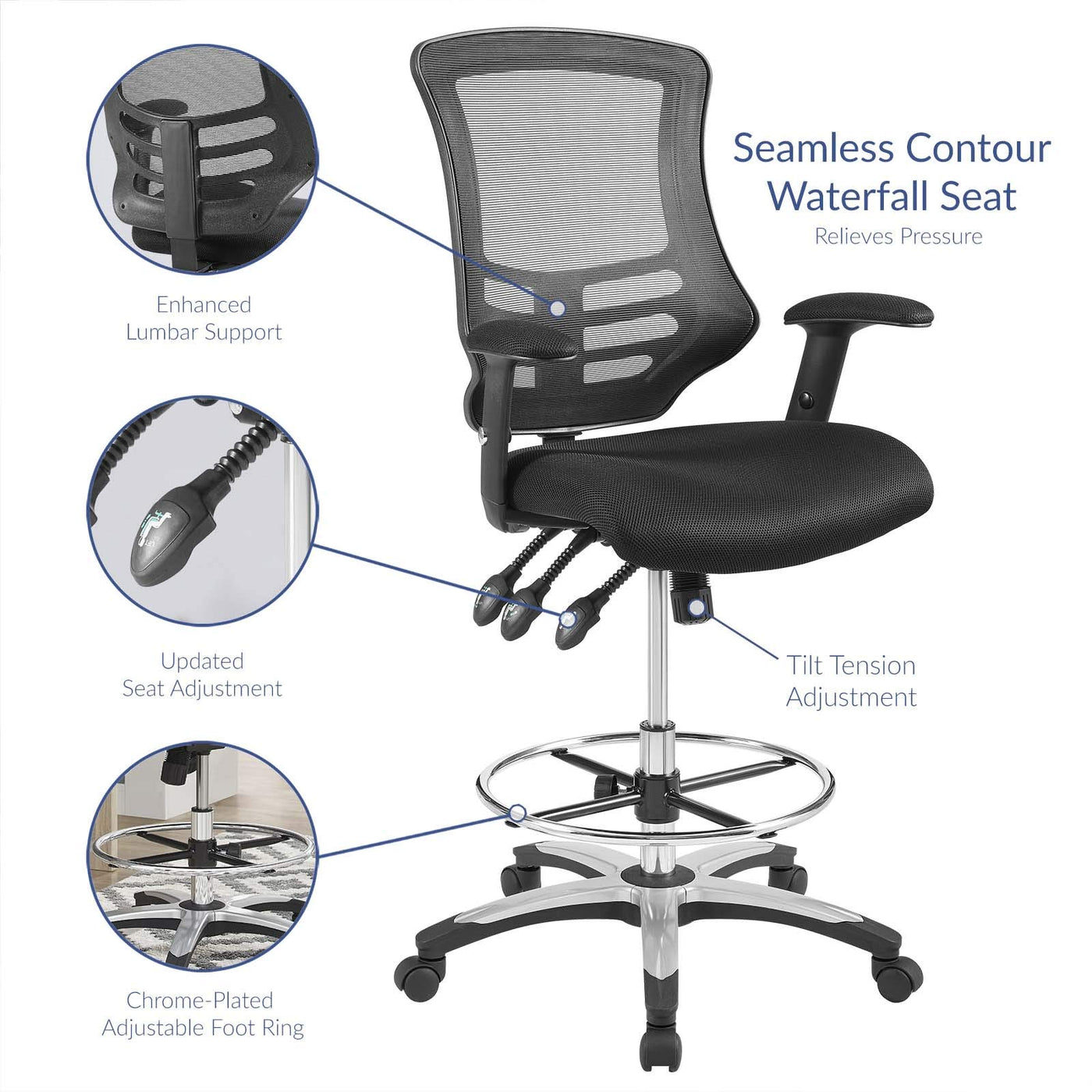 Cruise Through Daily Tasks With The Calibrate Tall Drafting Chair. This Sturdy Nylon Frame Standing Desk Chair Features Height Adjustable Armrests, A Breathable Mesh Back With Passive Lumbar Support, Dense Foam Padded Waterfall Seat Covered In Mesh, Full 360-Degree Swivel, And Five Dual-Wheel Casters For Natural Movement Over Either Carpeted Or Hardwood Surfaces. Experience Productivity Without Compromising On Comfort With This User-Friendly Computer Drafting Stool.