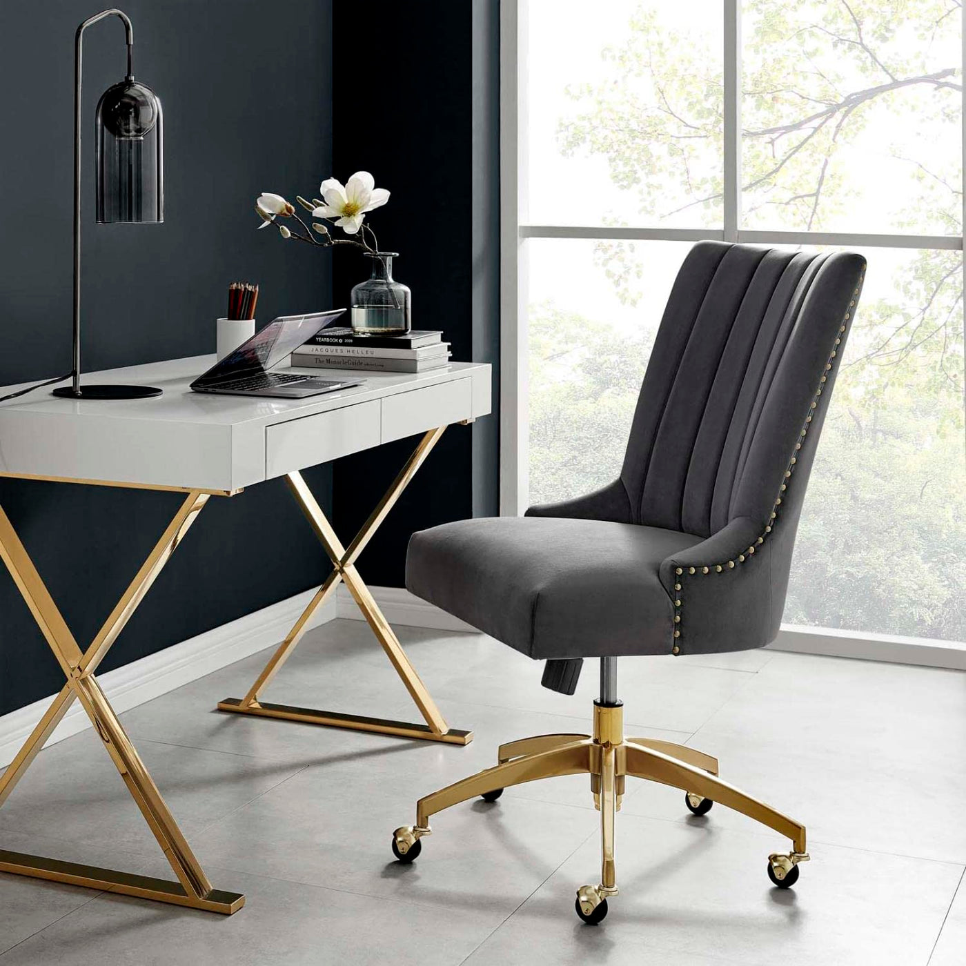 Inspire productivity in the workplace with the Empower Channel Tufted Performance Velvet Office Chair. Nailhead trim and channel tufting bring retro modern style to this office chair while dense foam padding and stain-resistant performance velvet upholstery offer exceptional comfort and support during the workday. A polished gold metal base and five single ball casters provide easy movement over hardwood or carpeted surfaces while a full 360º swivel, tilt tension control, and pneumatic height adjustment allow for personalized customization. Designed for the modern home or office, this upholstered desk chair is a stylish and functional addition to any workspace. Chair Weight Capacity: 287 lbs.