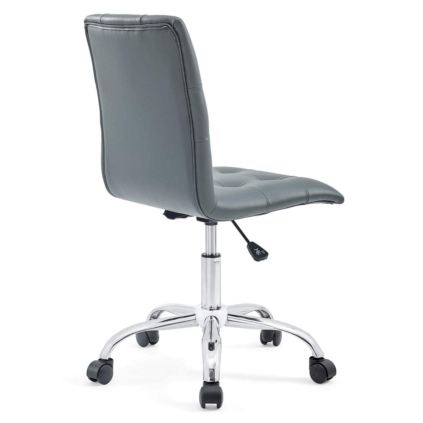Etiquette presides over the properly styled prim armless office chair. Modern to the touch, luxurious to the eye, prim features deep tufted buttons, skilled faux leather upholstery and elegant trim for added finesse. Prim is height adjustable, swivels to a 360 spin and comes outfitted with a polished chrome steel base with five dual-wheel nylon casters. Perfect for conference rooms, workstations or desks, prim is a modern piece that works admirably to further the finer civilities of life. Set Includes: One - prim mid back office Chair Product Dimensions: Overall product dimensions: 17.5"l X 21.5"w X 33.5 - 37"hseat dimensions: 16"l x 17.5"w X 21"hbackrest height: 16.5"hthickness Of cushion: 2"hthickness of backrest: 2"wbase length: 18.5"l.