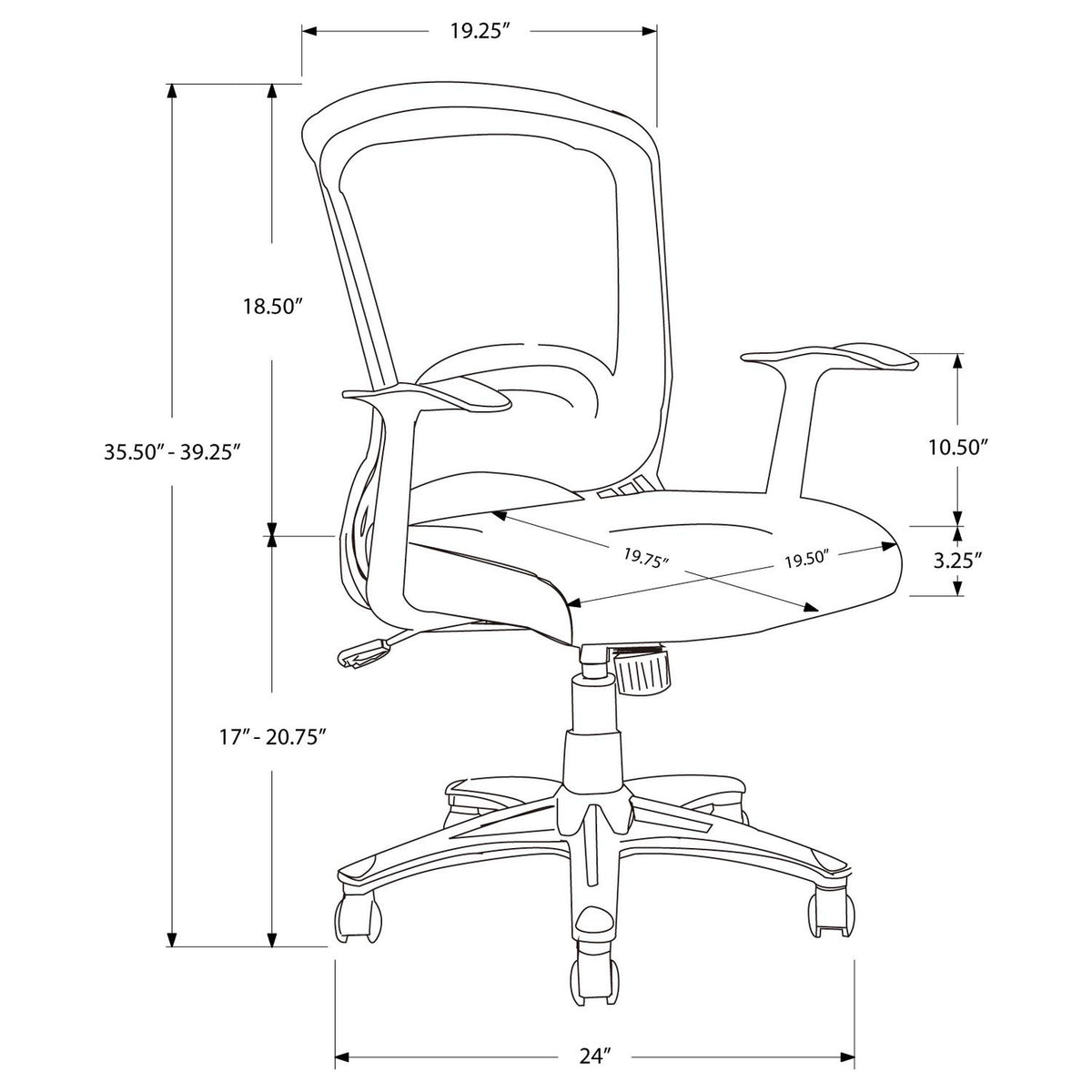 Get into the groove with this mid-back office chair in black that has curves in all the right places to provide comfortable support. Grooved, fixed armrests are a noteworthy feature of this desk chair. Their concave shape provides better, more comfortable support for the lower arms than straight armrests. The backrest is wide and has a curved, ergonomic shape that promotes good posture. It is covered in the same breathable, black mesh polyester fabric as the padded seat, which is wide and extra deep to offer a roomy feel. The seat swivels 360 degrees and the black 5-star base includes casters, making it easy to move while you remain seated. You can raise or lower the seat to your preference and control the tilt function with the lever located underneath the seat. This task chair conforms to BIFMA standards for office furniture and has a clean, contemporary style that is a great choice for smaller office spaces. Additional dimensions: Overall chair height: From 35.5 inches to 39.25 inches Height from floor to seat: From 17 inches to 20.75 inches Seat back: 19.25 inches W x 18.5 inches H Seat: 19.75 inches D x 19.5 inches W Weight: 27 lbs