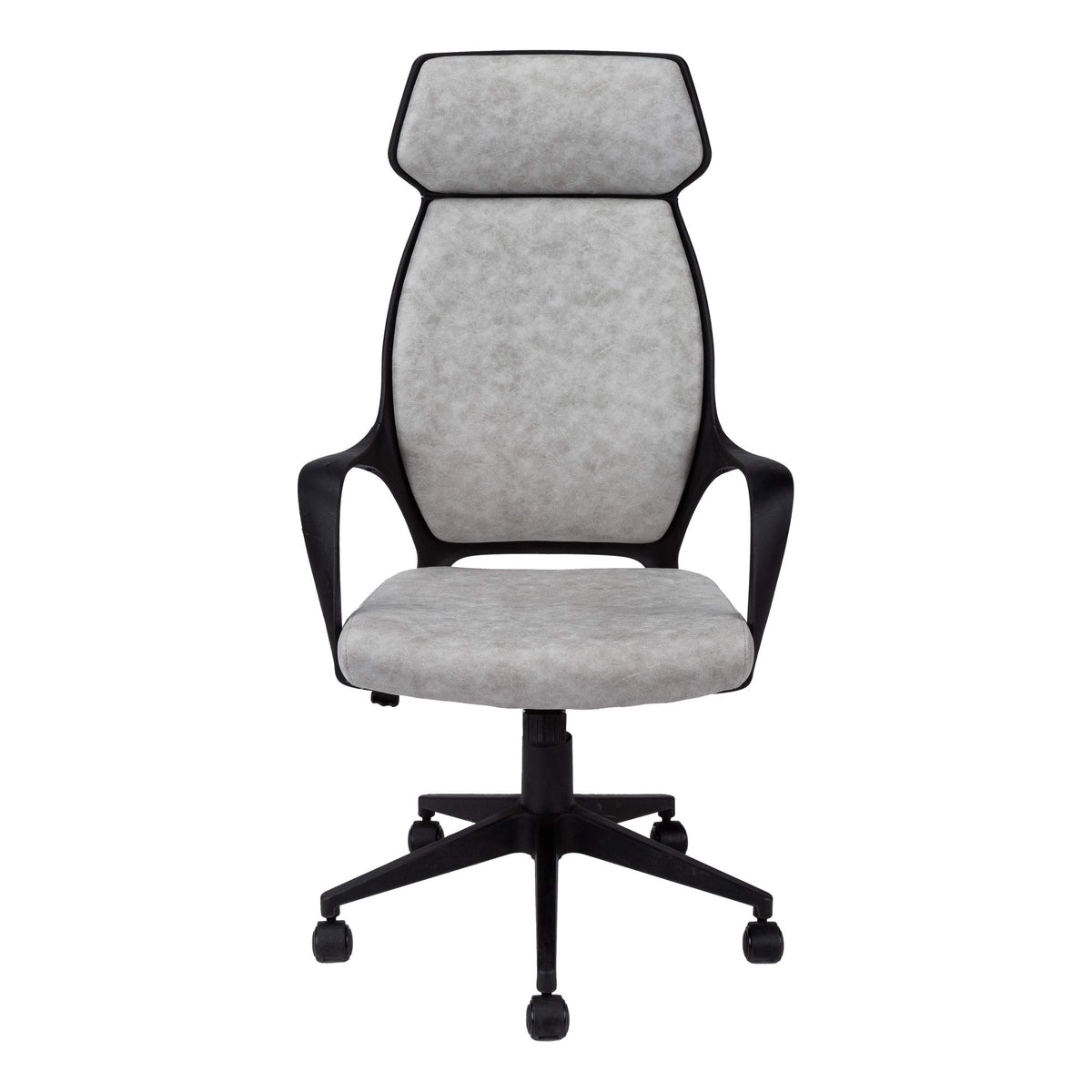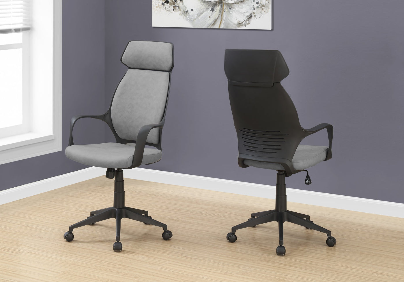 This executive office chair blends an attractively sleek, refined look with a pleasantly supportive, comfortable feel. The backrest is slender and tall with an integrated headrest and a curved, ergonomic shape that provides outstanding support. The high back, headrest, and 3.5-inch-thick seat are liberally padded for comfort and upholstered in a polyester-blend, grey microfiber fabric with minimal stitching for a clean look. The thick swivel seat is wide and extra deep to offer a roomy feel. An adjustable height mechanism that also controls the tilt function lets you adjust the chair to the ideal position for you, while a black 5-star base with casters gives you the freedom to glide around while you remain seated. This task chair with fixed armrests in black conforms to BIFMA standards for office furniture. It is a great choice if you are looking for a desk chair that offers comfort and support in a streamlined, contemporary style. Additional dimensions: Overall chair height: From 46 inches to 50 inches Height from floor to seat: From 18.5 inches to 22.5 inches Seat back: 15 inches W x 27.5 inches H Seat: 20 inches D x 19 inches W Weight: 28 lbs