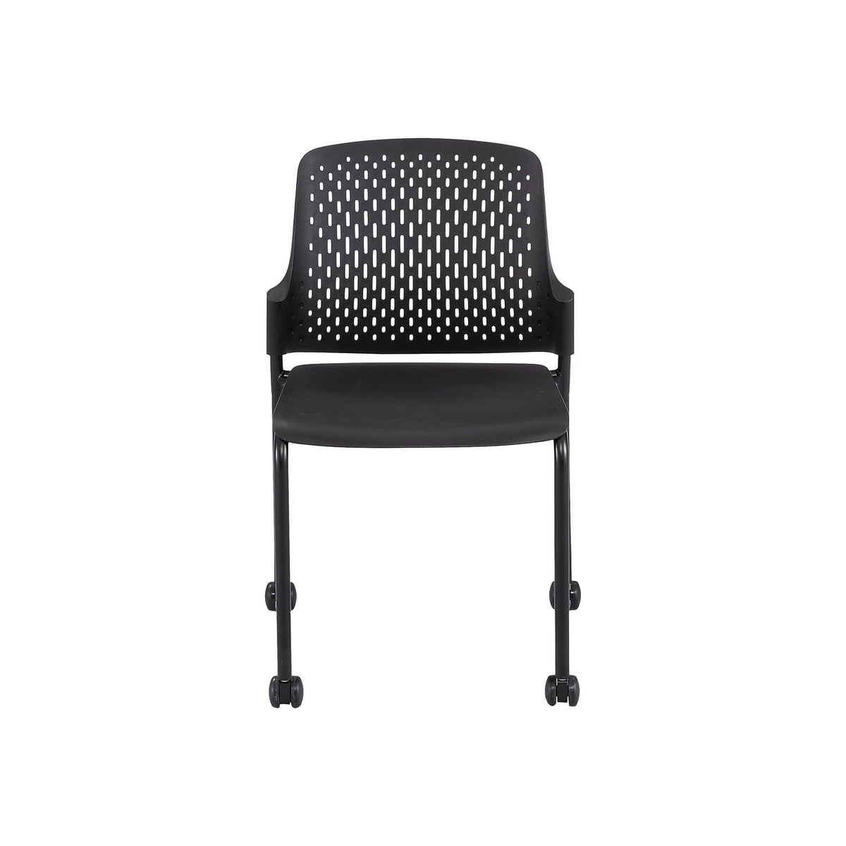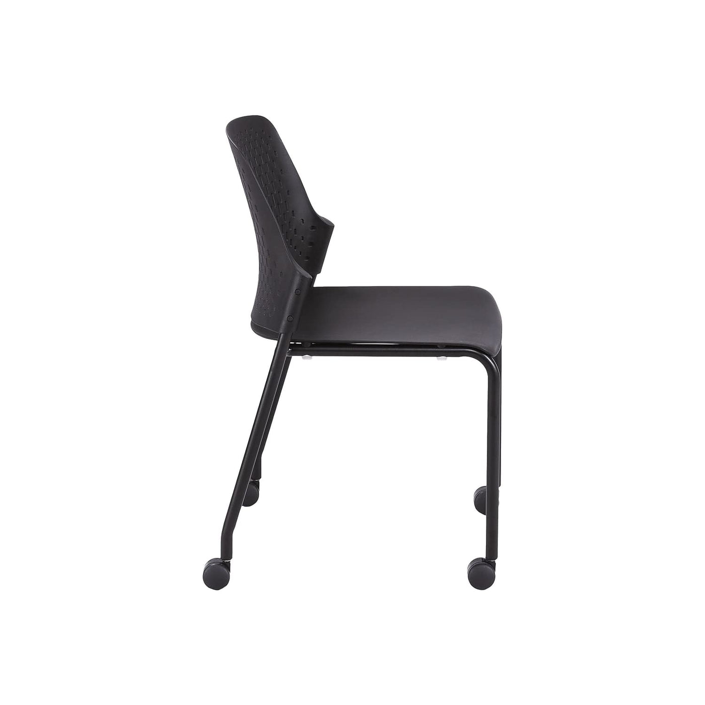 - Contemporary and simple stack chair design makes it easy to stack out of the way when not in use to help save space, great for training or meeting rooms. - Constructed of high-impact polypropylene seat and back for long-lasting durability; comes in black. - Mid-back design minimizes stress and strain. - Overall dimensions: 32.88"H x 22"W x 21.88"D. - Seat dimensions: 16.63"W x 16.63"D. - Back dimensions: 17"H x 16.25"W. - Product weight capacity 275 lbs. - No assembly required. - Four chairs per carton. - Perfect for use in lunchrooms, convention centers, event centers, breakrooms, lecture halls, modular workspaces, hoteling areas, business centers, libraries, and classrooms. - Contoured seat design with generous back for extra comfort. - Perforated back provides breathability to keep users cool. - Lightweight, tubular steel frame makes these chairs easy to pick up and move, rearrange, or stack as needed. - Stacks up to eight high on the floor or six high on chair cart (sold separately) for convenient storage when not in use. - Carpet casters come standard. - Meets or exceeds BIFMA and GREENGUARD standards.
