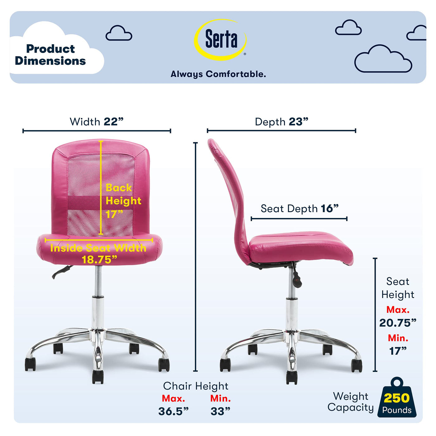 Outfit Your Dorm Room Or Home Office With The Serta Essential Computer Chair. Whether You’Re Working Or Gaming, This Faux Leather And Mesh Desk Chair Gives You Consistent Comfort And Support. The Ergonomic Chair Features A Breathable Mesh Back, Keeping You Cool As Deadlines Approach Or The Game Intensifies. An Adjustment Lever Lets You Customize The Seat Height, And Multi-Directional Casters Allow For Easy Mobility. This Armless Office Chair Fits A Variety Of Environments And Tucks Easily Under A Computer Desk Or Table.
