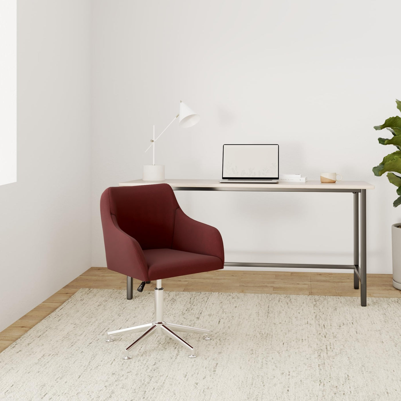 With its stylish and modern design, this rotating office chair is a practical and modern addition to any living room, bedroom, lounge area or office. The seat and backrest are ergonomically shaped, covered with soft fabric and thickly padded with foam, which makes the chair very comfortable. The backrest supports your back to reduce pressure on your spine. The wooden frame and steel legs contribute to durability and aesthetic pleasure. The chair can be rotated 360 degrees and is height adjustable thanks to the gas lift. The office chair is easy to assemble. Colour: wine red Material: cloth + plywood + steel legs Overall dimensions: 55 x 53 x 78-92 cm (W x D x H) Seat width: 42 cm Seat depth: 40 cm Seat height from floor: 42-56 cm Backrest height: 40 cm Armrest height: 13 cm Star foot length: 26 cm Material: 100% polyester