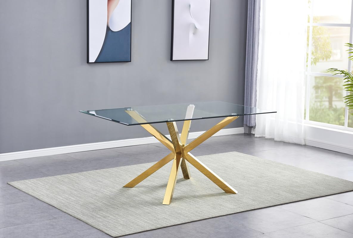 Elevate your dining experience with the luxurious 5-Piece Glass Dining Set with Gold Chrome Finish by Best Quality Furniture. Crafted with both style and durability in mind, this set effortlessly combines elegance and functionality to enhance your dining space. At the heart of this set is the stunning tempered glass table top, supported by a striking x-cross style base in a radiant gold chrome finish. The table's modern design creates a captivating focal point that is sure to impress your guests and elevate the ambiance of any dining room. Accompanying the table are four chairs, each featuring sleek iron legs in a matching gold chrome finish. These chairs are as comfortable as they are stylish, with plush velvet upholstery available in four rich color options: indulge in chic dark gray, sophisticated navy blue, classic black, or elegant cream. Designed for both comfort and stability, each chair is equipped with adjustable levelers to ensure a perfect fit on any surface. Additionally, the small hole on the bottom of the chair back adds a subtle touch of refinement.