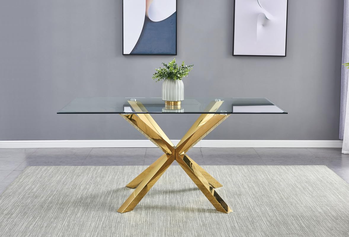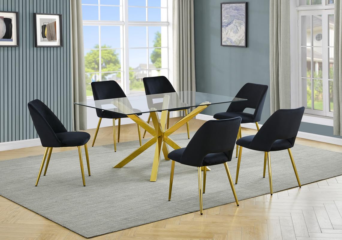 Elevate your dining experience with the luxurious 7-Piece Glass Dining Set with Gold Chrome Finish by Best Quality Furniture. Crafted with both style and durability in mind, this set effortlessly combines elegance and functionality to enhance your dining space. At the heart of this set is the stunning tempered glass table top, supported by a striking x-cross style base in a radiant gold chrome finish. The table's modern design creates a captivating focal point that is sure to impress your guests and elevate the ambiance of any dining room. Accompanying the table are six chairs, each featuring sleek iron legs in a matching gold chrome finish. These chairs are as comfortable as they are stylish, with plush velvet upholstery available in four rich color options: indulge in chic dark gray, sophisticated navy blue, classic black, or elegant cream. Designed for both comfort and stability, each chair is equipped with adjustable levelers to ensure a perfect fit on any surface. Additionally, the small hole on the bottom of the chair back adds a subtle touch of refinement.