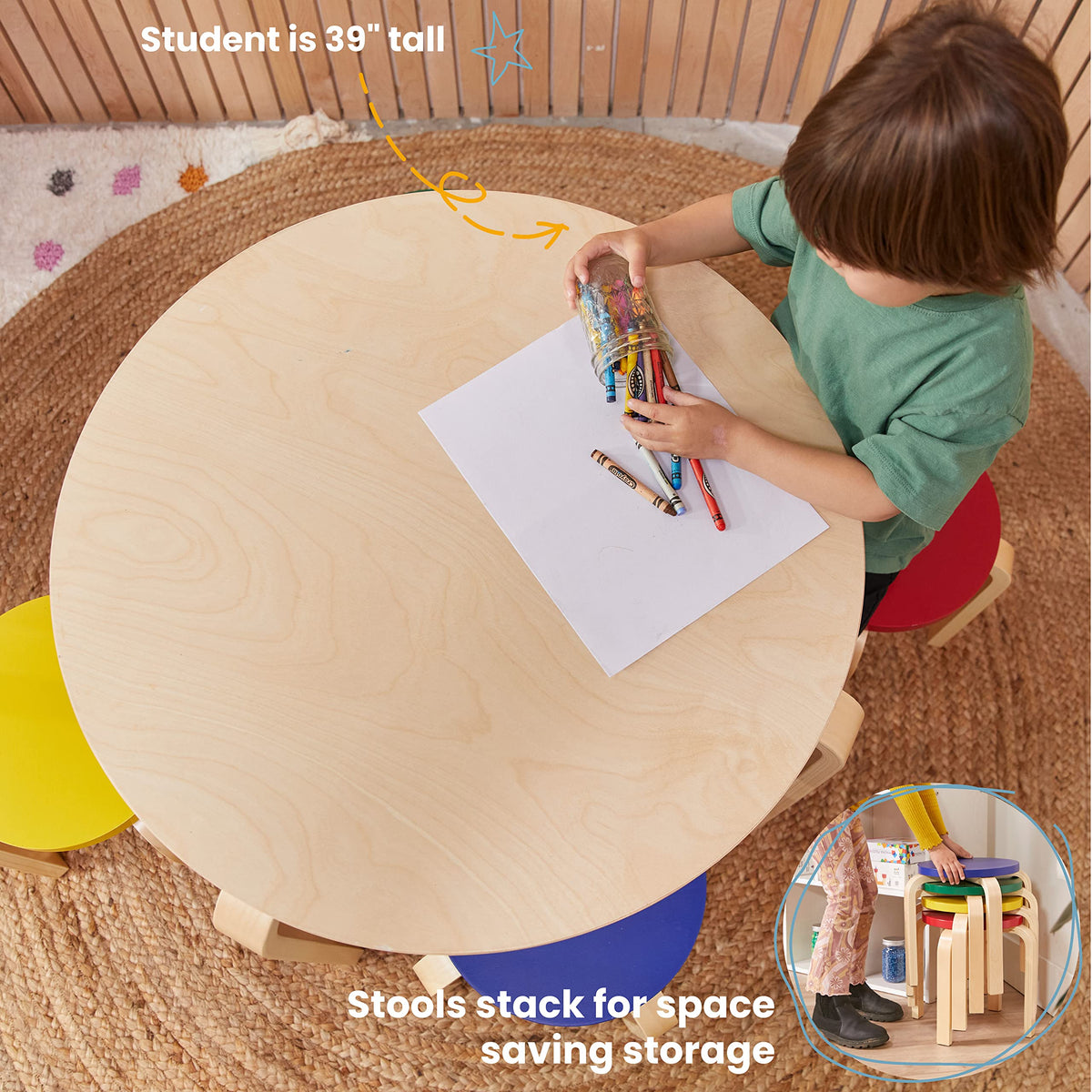 Complete Set: This five-piece set includes one round bentwood activity table and four stools, ideal for classrooms, bedrooms, kitchens, and playrooms.