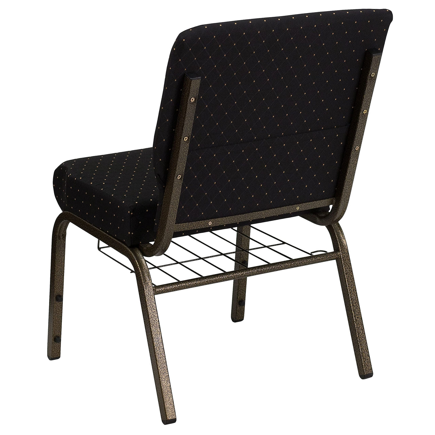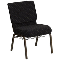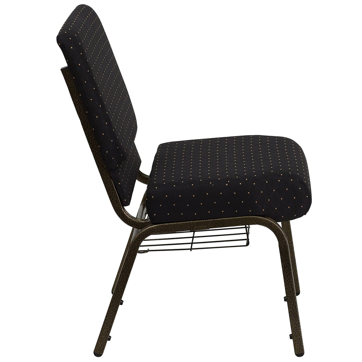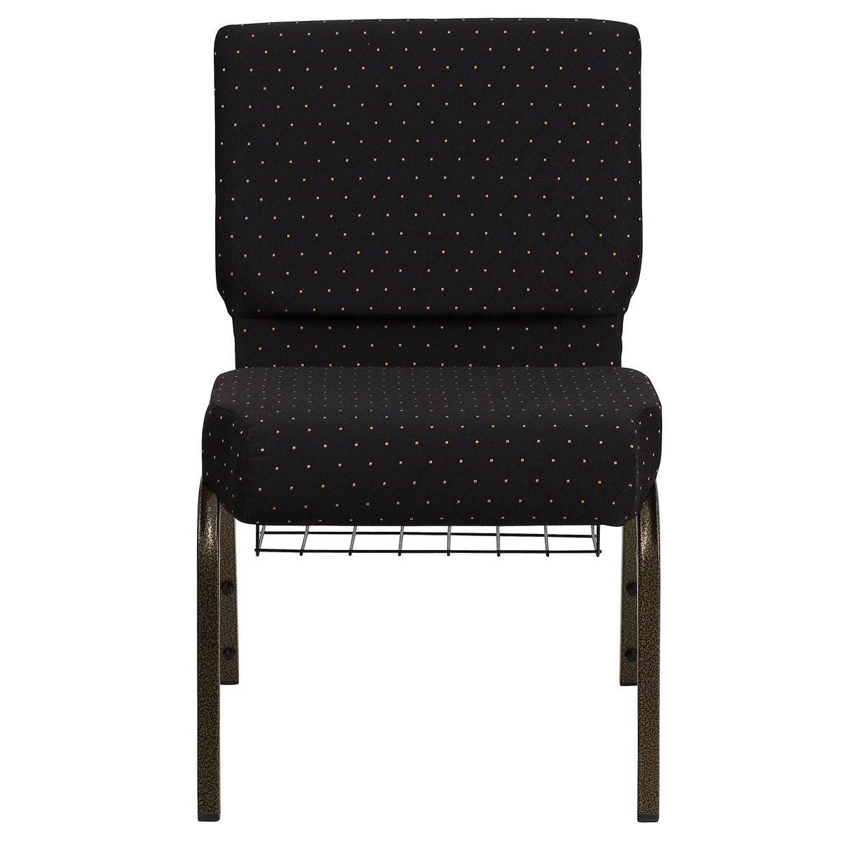 Flash Furniture Hercules Church Chair Features Gold Vein Frame Finish With Black Dot Patterned Fabric Upholstery And 4'' Thick Waterfall Edge Comfortable Seating. Flash Furniture Hercules Church Chair With Waterfall Seat For Reduced Leg Strain Has 800 Lbs Capacity. 21'' Extra Wide Black Dot Patterned Fabric Upholstered Chair Has A Book Pouch On Back And A Communion Cup Book Rack. Black Dot Patterned Fabric Upholstery. Armless. Dimensions: 33''H X 21''W X 24 3/4''D. Seat Size: 19''H X 21''W X 18 1/2''D; Back Size: 16 1/2''H X 21''W. Weight Capacity: 800 Lbs. 3 1/2'' Thick Cushion Graduates To 5'' Thick. Waterfall Seat Reduces Leg Strain. Book Pouch On Back. 16 Gauge Steel Frame. Gold Vein Frame Finish.Book Rack With Communion Cup Holder. Ganging Clamps. Plastic Rocker Glides.
