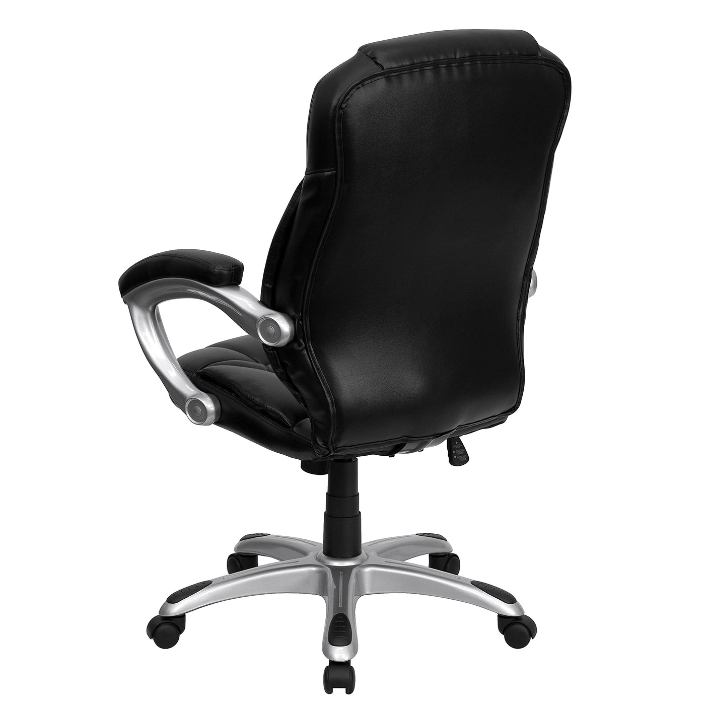 Flash Furniture High Back Leather Contemporary Office Chair With Black Leathersoft Upholstery And Waterfall Seat Features Dual Wheel Casters And Double Padded Seat And Back With Built-In Lumbar Support While Allowing Pneumatic Seat Height Adjustment. The Flash Furniture Contemporary Executive Chair In An Attractive Black Shade Blends With Any Decor And Will Be The Perfect Addition To Your Office Space. Furnished With High-Quality Leathersoft Upholstery, This High-Back Executive Chair Adds A Fresh Look To Your Workspace. Its Pneumatic Seat Height Adjustment Mechanism Regulates The Chair Height And Provides A Balanced Support To Lower Back. This Chair Has A Tilt Function That Allows You To Recline While Reading Or Working. The Chair Has Lumbar Support That Conforms To Your Back Curve For Optimum Comfort. Boost The Modern Style Of Your Office Space With The Contemporary Look Of This Flash Furniture High-Back Office Chair. The Black Leathersoft Upholstery Offers A Fashionable Contrast To This Chair'S Chrome-Finished Frame, And Its Padded Seat And Back, Multiple Adjusters, And Lumbar Support Make It Comfortable Enough For Daily Use At Your Desk. Black Leathersoft Upholstery. Padded Silver Finished Nylon Loop Arms. Dimensions: 41.5 - 45 1/4"H X 27.5"W X 27.5"D. Pneumatic Seat Height Adjustment. Built-In Lumbar Support. Tilt Tension Control, Spring Tilt Control Mechanism. Dual Wheel Casters, Heavy Duty Silver Finished Nylon Base With Black End Caps. Seat Size: 18.25 - 22"H X 20 3/4"W X 20 1/2"D, Back Size: 21 1/2"W. Weight Capacity: 250 Lbs. Some Assembly Required.Finish: Silver Nylon. Chair Back Style: High Back. Double Padded Seat And Back.