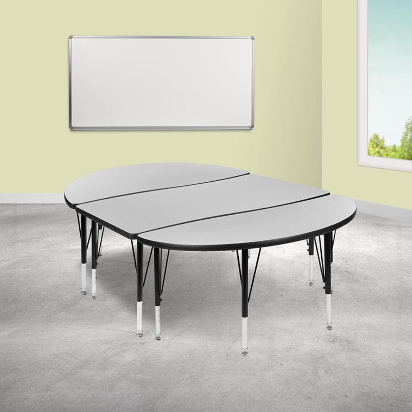 Develop Students Interpersonal Skills With These Flexible Learning Wave Activity Tables That Are Shaped For Group Learning Success. Students Will Have Plenty Of Working Space On This 3-Piece Nesting Classroom Table With Two Half Circle End Pieces And A Rectangular Middle Table. Complete With Seating By Pairing With Our Ergonomic Shell Stack Chairs.Built To Last Through Many Class Turnovers The Thermal Fused Laminate Top Is Scratch, Stain And Warp Resistant. An Attractive Black Powder Coated Finish Protects The Upper Legs From Scratches And Height Adjustable Chrome Lower Legs Give You The Flexibility To Raise Or Lower The Table A Full 9" In 1" Increments. Self-Leveling Nylon Floor Glides Keep The Table From Wobbling And Protect Your Floor By Sliding Smoothly When You Need To Move It.Students Of The 21St Century Will Look Forward To Learning On Modern Classroom Tables, Do Not Allow Your Classroom Setting To Fall Behind. Create Unlimited Combinations Using Various Shaped Nesting Activity Tables In Your Classroom, Lab, Or Library.