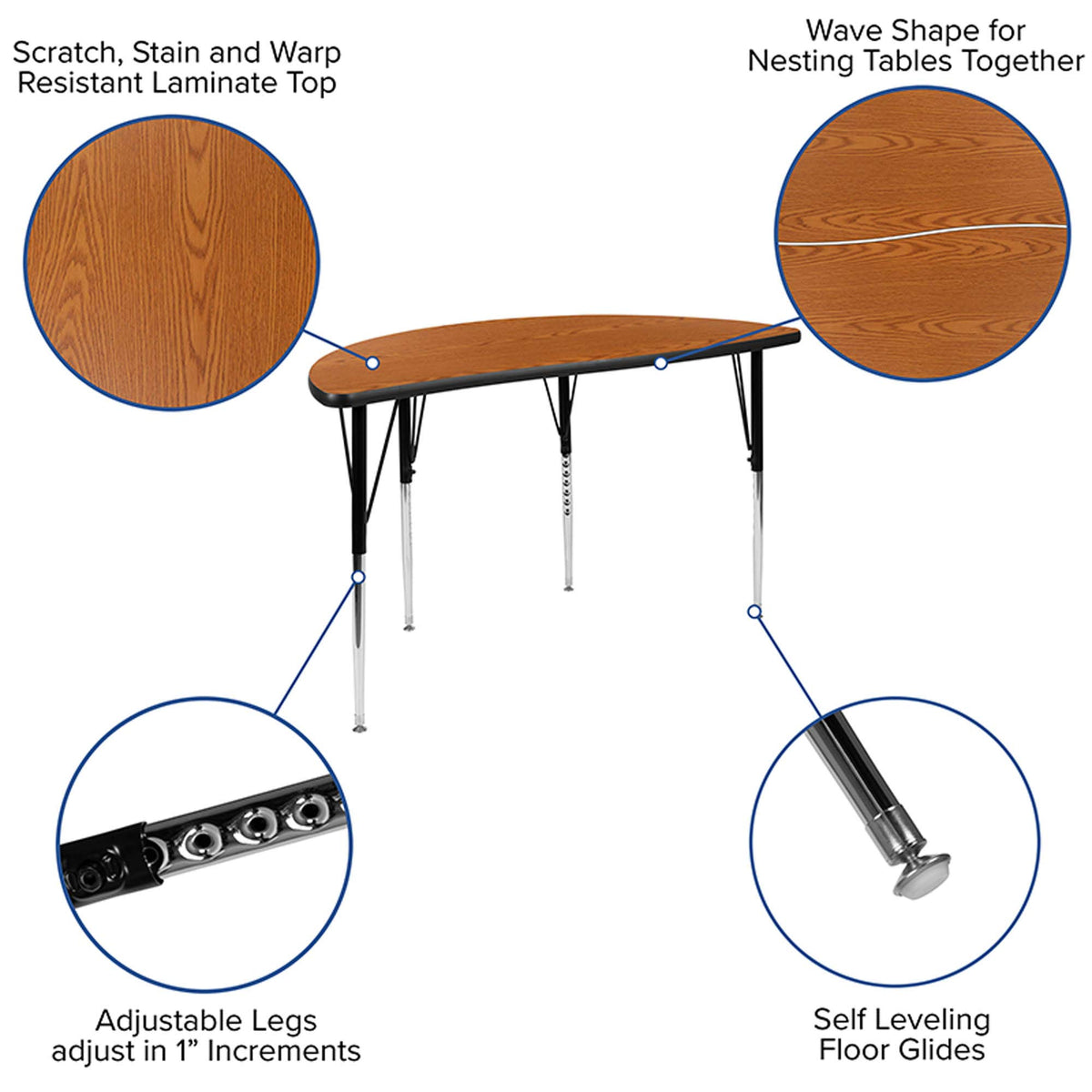 Flash Furniture 47.5" Half Circle Wave Collaborative Oak Thermal Laminate Activity Table - Standard Height Adjustable Legs