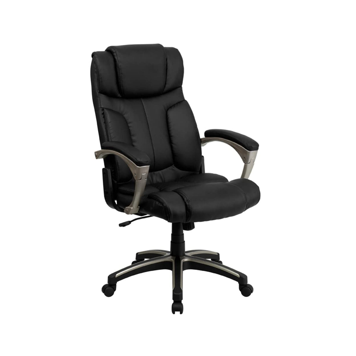 This Unique Office Chair Folds If You Have The Need To Slide Under Your Desk Or Give Your Office An Open Feeling When Not In Use. The Two Thumb Sliders Placed On The Sides Of The Chair Make It An Easy Transition To The Folding Position. Chair Also Features A Locking Tilt Control, Pneumatic Seat Lift And A Sturdy Nylon Base That Is Trimmed In Silver. [Bt-9875H-Gg] High Back Swivel Chair. Foldable Back To Fit Under Desk. Thumb Sliders On Side Of Chair Releases Back. Folded Height: 23'' - 26''. Built-In Lumbar Support. Locking Tilt Control Mechanism. Pneumatic Seat Height Adjustment. Padded Nylon Arms. Heavy Duty Silver Trimmed Nylon Base. Dual Wheel Casters. Black Leathersoft Upholstery. Leathersoft Is Leather And Polyurethane For Added Softness And Durability. Ca117 Fire Retardant Foam..