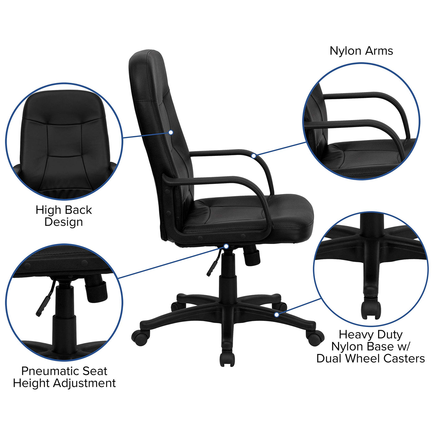 This vinyl upholstered office chair is a great option for your office or home. High back office chairs have backs extending to the upper back for greater support. The high back design relieves tension in the lower back, preventing long term strain. The waterfall front seat edge removes pressure from the lower legs and improves circulation. Chair easily swivels 360 degrees to get the maximum use of your workspace without strain. The pneumatic adjustment lever will allow you to easily adjust the seat to your desired height.
