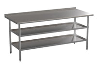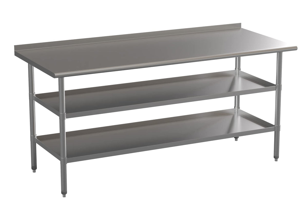 Kitchen space is always at a premium so this commercial stainless steel work table with dual adjustable undershelves and backsplash is an excellent solution. Great for bulk food preparation for businesses such as daycares, hotels and restaurants, this versatile steel table can be placed against a wall or used as a freestanding kitchen island. The 1.5' backsplash helps keep your walls free of food debris and prevents items from rolling away reducing breakage and waste. Strength and durability are important factors when choosing equipment. Made from quality stainless steel, this metal utility table resists corrosion and holds up to 600 lbs. weight capacity while the undershelves hold up to 200 lbs. each. This commercial grade work table is certified to NSF quality standards reducing the chance of foodborne illness. Not only for kitchen use, this stainless prep table can be used in an outdoor kitchen away from the elements on a covered patio or deck, as a planting station in your greenhouse or a work surface in your garage. Rounded corners prevent scrapes and cuts and this multi-use work table easily assembles in under 10 minutes with the included tools. Adjustable feet move up to 1' to keep you level on uneven flooring. Remove any traces of food contaminants with water and a neutral detergent followed by a dry cloth to keep this shiny piece looking new.
