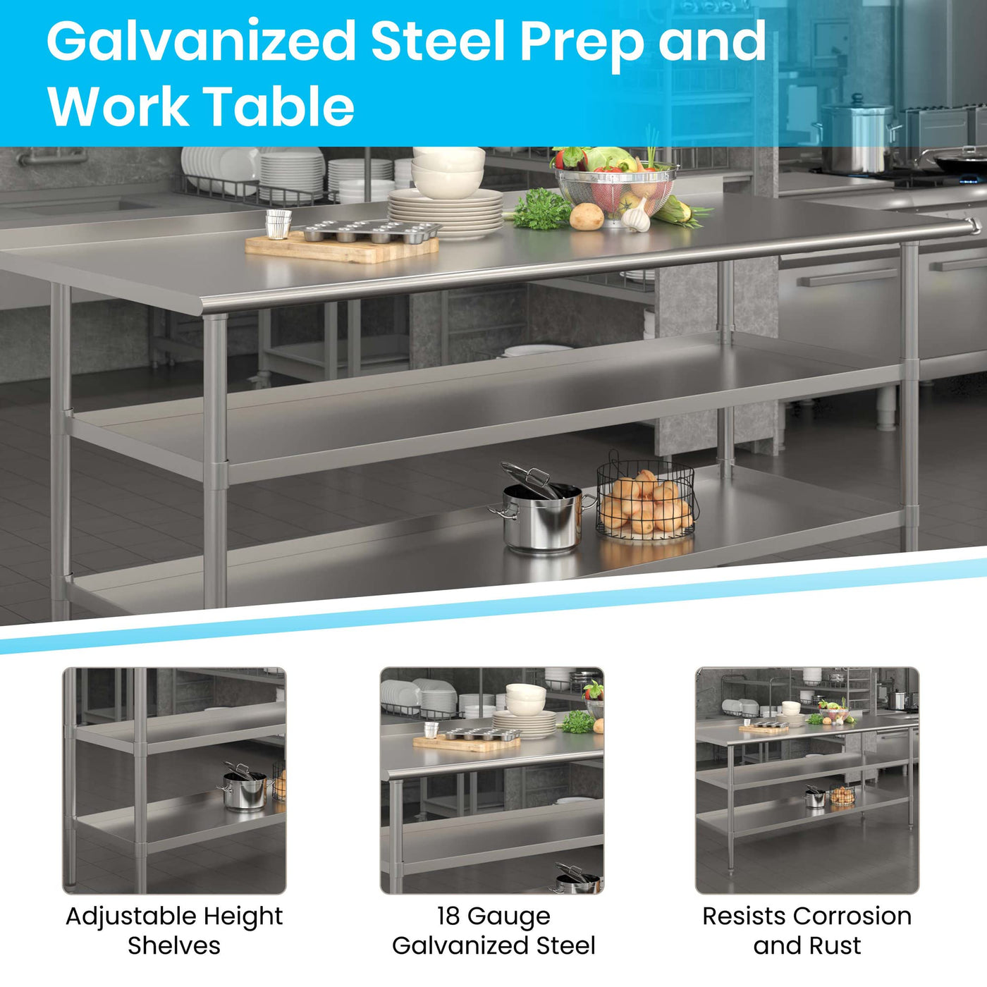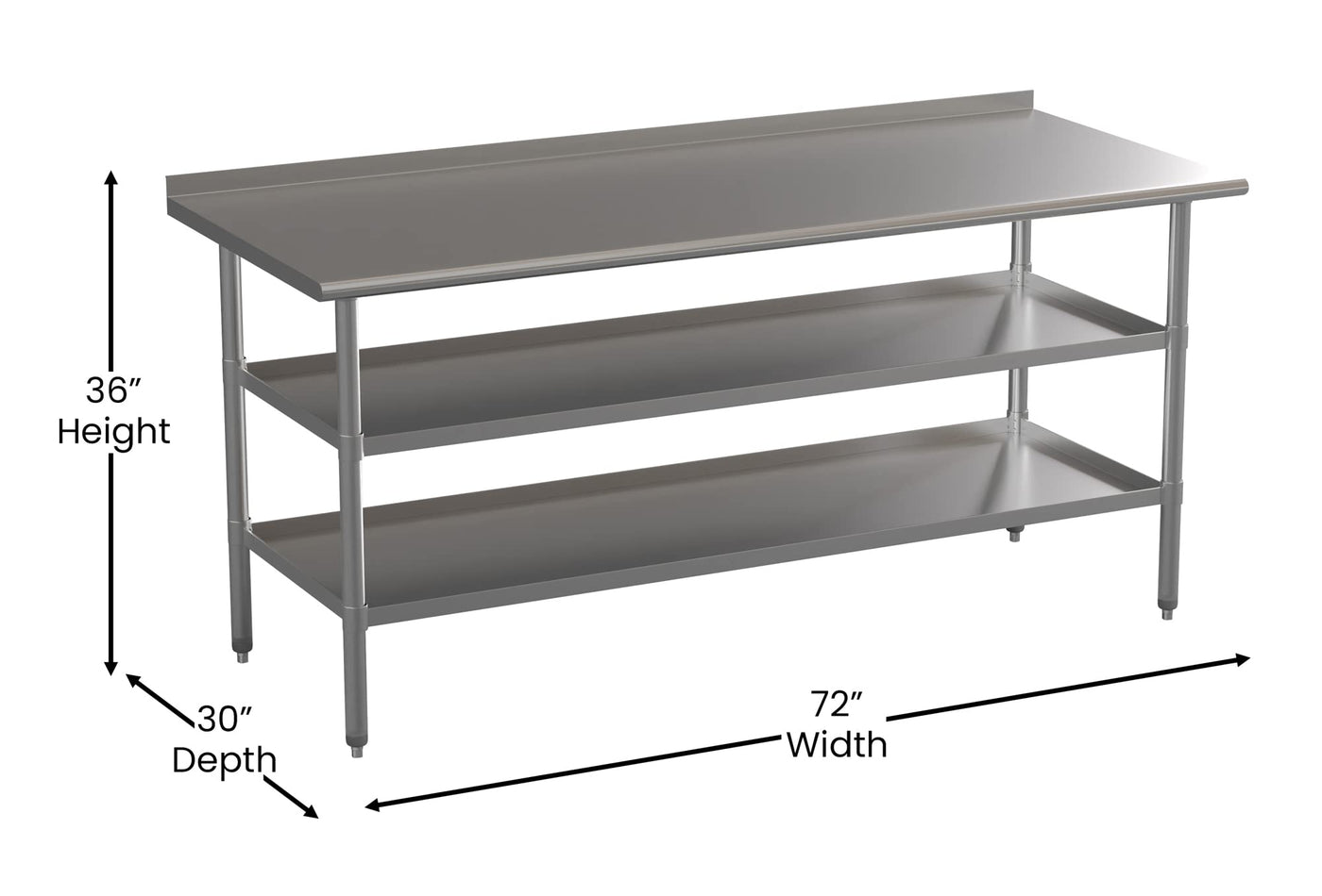 Flash Furniture Ravenel Stainless Steel 18 Gauge Work Table With 1.5' Backsplash And 2 Undershelves - 72'W X 30'D X 34.5'H, Nsf