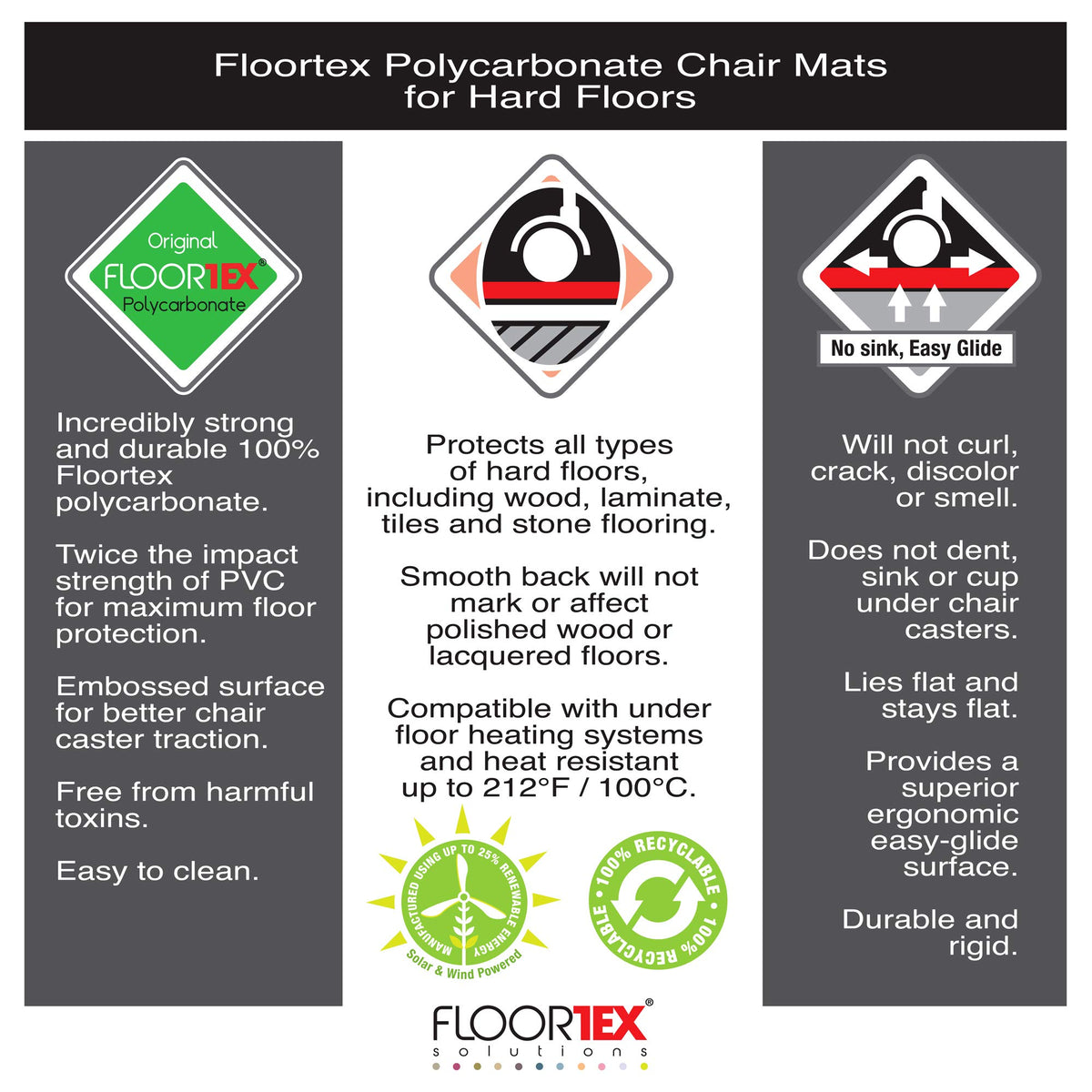 Cleartex circular mat is a general purpose mat providing the ultimate hard floor protection. Strong and durable, this Clear round mat is made from sturdy polycarbonate, which has double the strength of PVC - and the added benefits that it won’t scratch, crack, buckle, curl up, or discolor and it has no odor. The Ultimat has ergonomic benefits for chair users and allows an easy glide movement which can reduce leg fatigue. Ultimat is environmentally safe, Free from PVC and free from toxic chemicals, making it a good choice for people with allergies. Cleartex polycarbonate mats lie perfectly flat and can be used immediately.