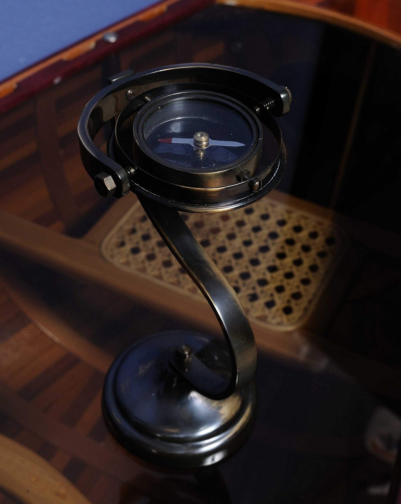 This is a fully functional gimbaled compass. It is made of high quality brass. Each component is crafted with the finest craftsmanship. Compass, body, and round stand is made of solid brass while other parts are made of brass strip. Available in antique brass finish and it comes on a solid brass stand. This compass is a great addition to any nautical collection. The item dimensions are: L: 3.5 inches, W: 3.5 inches, H: 7 inches.