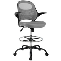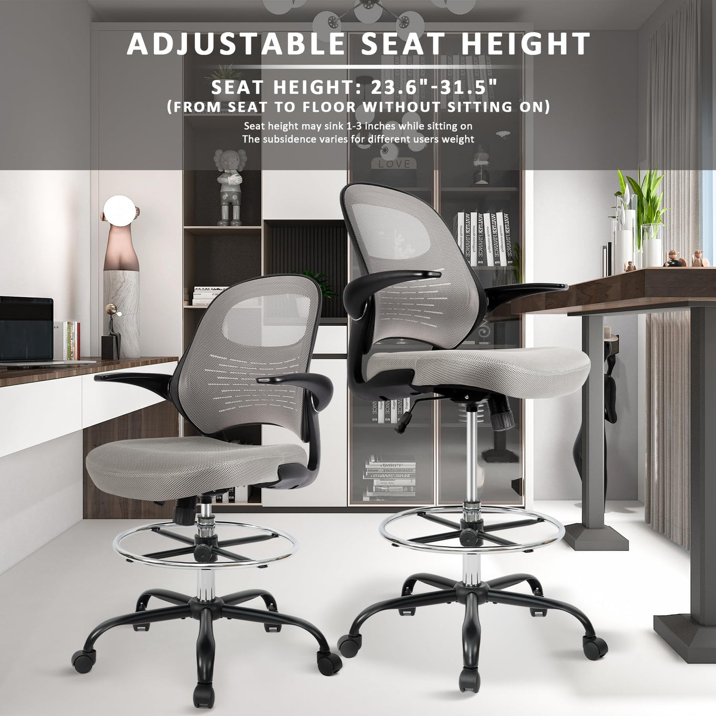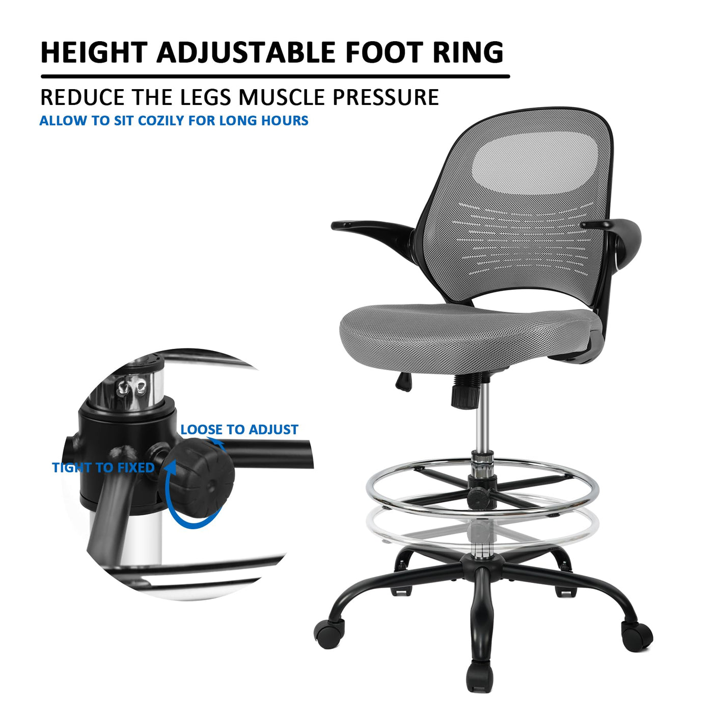 ?Have A Comfortable And Relaxing Working Day With Our Adjustable Drafting Chair!?Performance:? Ergonomic Backrest: Curved Contours Backrest Can Help Keep Your Back Supported, Your Spine Remain Lifted, And Your Body Properly Aligned, Which Provides Optimal Support For Your Back When Sitting For Prolonged Periods Of Time.? For Different Height Needs: To Raise The Seat, Remove Your Weight From The Chair, Then Pull Up On The Control Handle. To Lower The Seat, Stay Seated And Pull Up On The Handle Until You’Re At The Preferred Height.? Adjustable Foot Ring: This Tall Drafting Chair Has A Height-Adjustable Footrest That Helps You Move Your Feet More Often And Reduce Pressure On The Back Of Your Legs.? Tilt And Lock: 120° Rocking Mode Is Available. To Let Your Chair Tilt Back, Pull Out The Control Handle. To Stop It From Tilting, Pull In The Control Handle.? A Tilt-Tension Knob Underneath The Seat Makes It Easier Or Harder To Recline Back In Your Chair, Depending On Which Way You Turn The Knob.? Flip-Up Armrests: The Armrests Can Be Flipped Up, So That You Can Have Better Rest And Is Space Saving.? Breathable Mesh: Mesh Back Will Promote Air Circulation, Allowing You To Sit Cozily For Long Hours.? Smooth Rolling Casters: Five Dual-Wheel Casters For Easy Gliding Over Carpeted Surfaces.?Specifications:Capacity: 285Lbsseat Height: 21.7'-29.7' (From Seat To Floor)Seat Width & Depth:(W)19.3' * (D)18.5'Backrest Height: 19.3'?Package Contents:Mesh Chair*1 (Installation Required)Manual Instructions*1?Note: When You Received The Package, Please Confirm That All The Parts Are Contained And In Well Condition?Warranty:If There Were Any Quality Problem With This Office Chair, We Provide 2 Year Free Replacement Parts Or Refund Warranty.