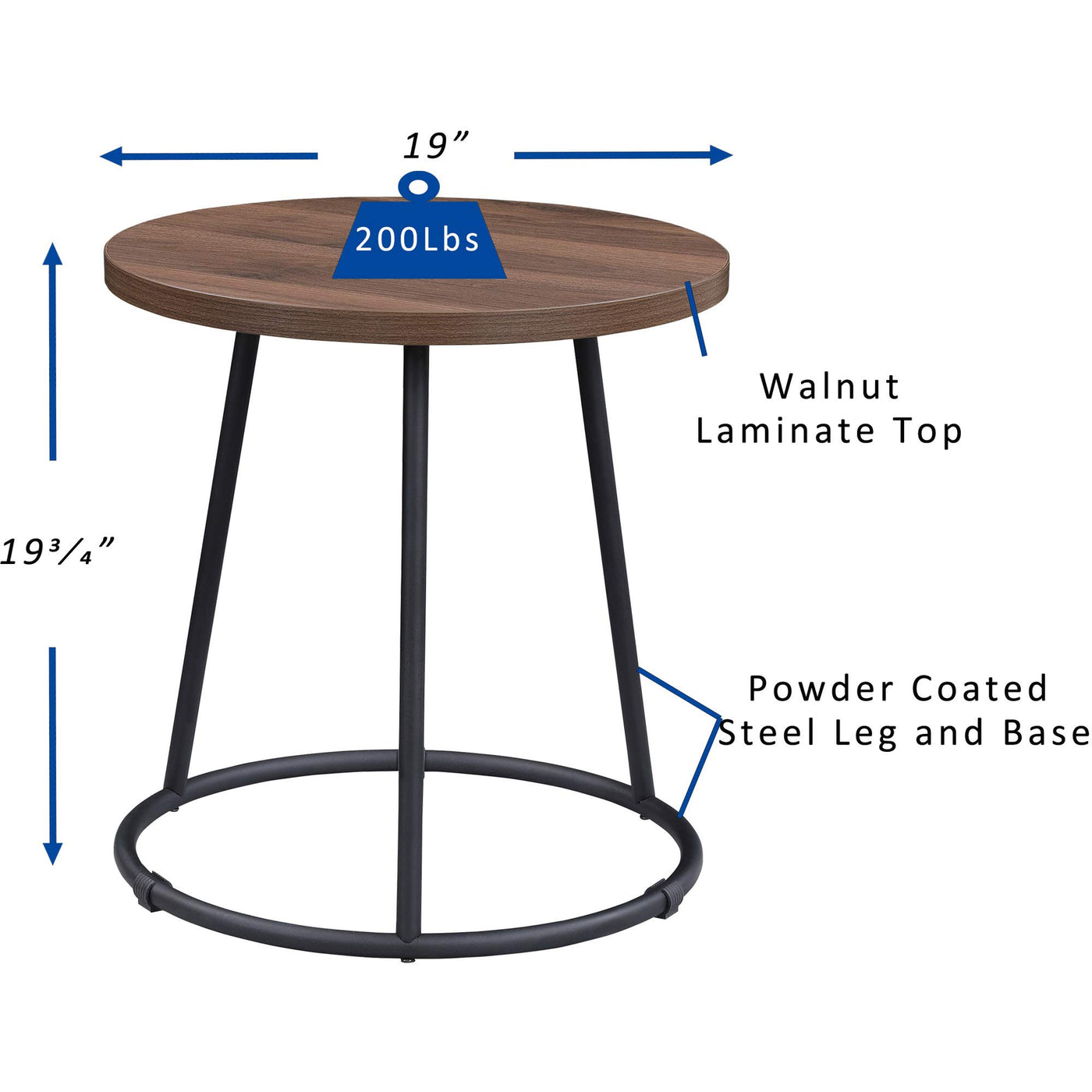 Lorell End Table, Round, Steel Base, 19"x19-3/4" , WalnutRound side table departs from the traditional with an industrial style. Durable laminate, 1" thick top with PVC edge is supported by four metal legs and a circular base. Base and legs are made of powder-coated steel so you can count on sturdy foundation along with a rugged look. Weight capacity is 200 lb. Lorell Lorell End Table, Round, Steel Base, 19"x19-3/4" , Walnut Features: Durable Features: Rugged Features: Sturdy Manufacturer: Lorell Product Name: Round Side Table Maximum Load Capacity: 200 lb Brand Name: Lorell Country of Origin: China Recycled: No Assembly Required: Yes Height: 19.75" Table Top Shape: Round Base Included: Yes Base Style: Four Leg Table Top Diameter: 19" Number of Legs: 4 Base Material: Steel Base Material: Metal Table Top Thickness: 1" Assembly Description: Assembly Required Color/Finish: Walnut Top Material: Laminate Base Color/Finish: Powder Coated Edge Material: Polyvinyl Chloride (PVC)