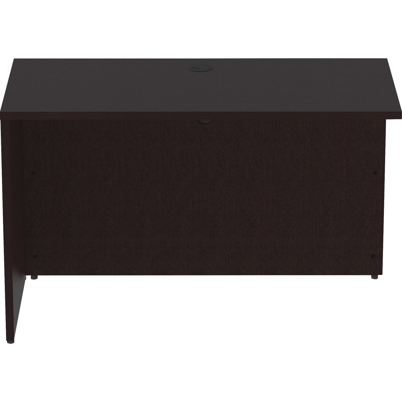 Rectangular return shell is part of Lorell Essentials Series Laminate Furniture with high-quality laminate construction and metal-to-metal, cam-lock connections. Espresso laminate top is 1" thick for durability. Use the grommet hole in the top for easy cord routing. Design also includes a full modesty panel for privacy, 3mm PVC edges and adjustable feet. Return cannot be used freestanding