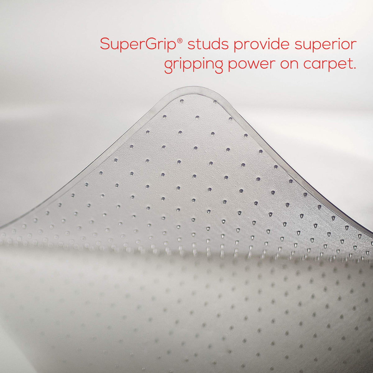 Chairmat with a wide lip is designed and properly weighted for low-pile carpets up to 1/4" with little or no padding. Design features less than 1/8" thick vinyl construction and a beveled edge. Gripper back keeps the mat in place on a variety of carpet styles. Textured surface on chairmat resists scuff marks and slips. More from the Manufacturer