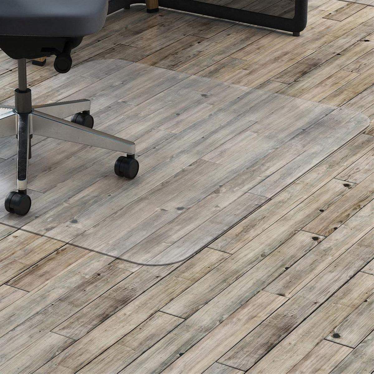 Perfect for Big and Tall applications, resilient chairmat with no lip is designed for hard floors including wood, vinyl and tile. Durable surface protects floors from chair scuffs and caster damage. Its exceptional clarity lets the beauty of the floor show through, while its easy-glide rolling surface provides effortless chair mobility. Rectangular polycarbonate chairmat with a straight edge is nonstudded for smooth, nonslip placement on hard floors. More from the Manufacturer