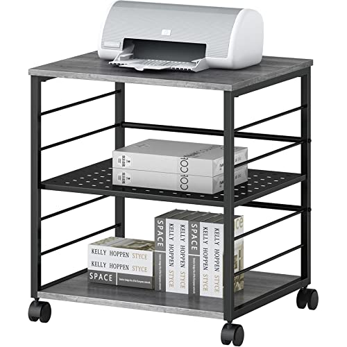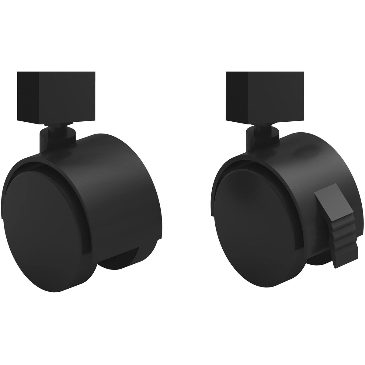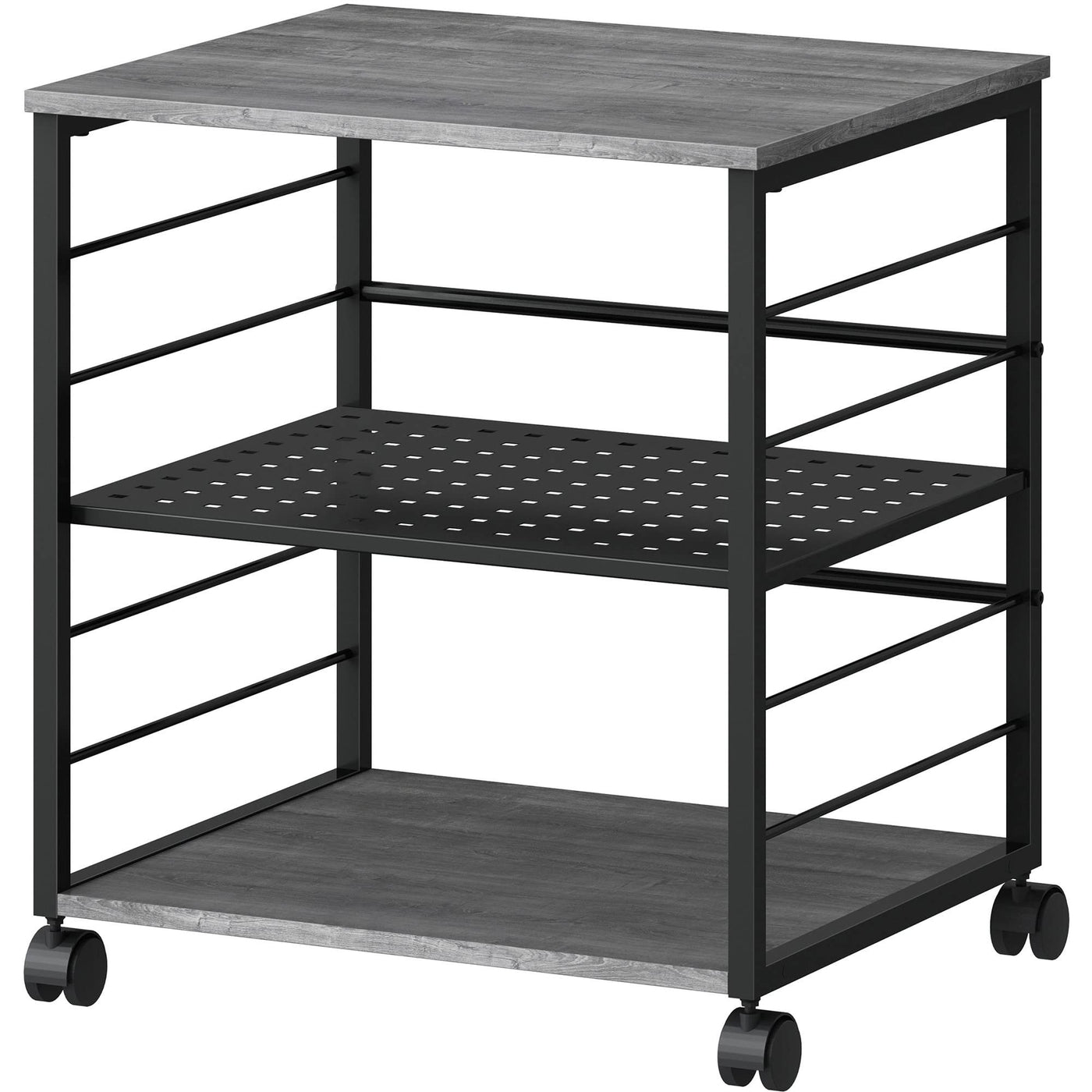 Deskside Mobile Machine Stand with three shelves easily rolls beside your desk to hold your essential devices. Metal frame with black powder coating offers sturdy support. Top shelf holds up to 100 lb., and two bottom shelves each hold up to 50 lb. Perforated hole pattern on middle metal shelf dissipates heat to keep equipment running cool and efficient while reducing the chances of any possible overheating. The 3/5" thick shelves feature a weathered charcoal laminate and PVC edge. Open back and sides allow easy cord management. Two of the four 2" diameter, dual-wheel casters lock to park the machine stand where you need it.