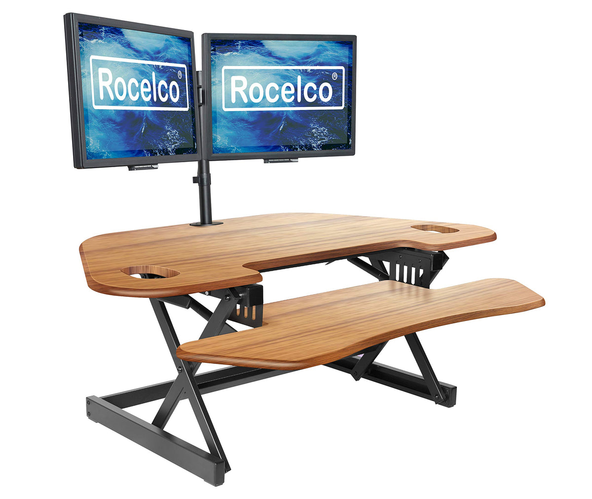 Rocelco 46" Height Adjustable Corner Standing Desk Converter with Dual Monitor Arm BUNDLE - Quick Sit Stand Up Computer Workstation Riser - Extra Large Keyboard Tray - Teak Wood Grain (R CADRT-46-DM2)