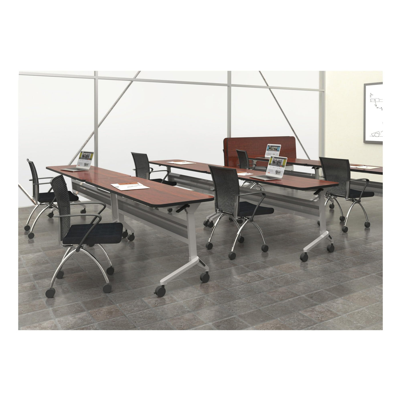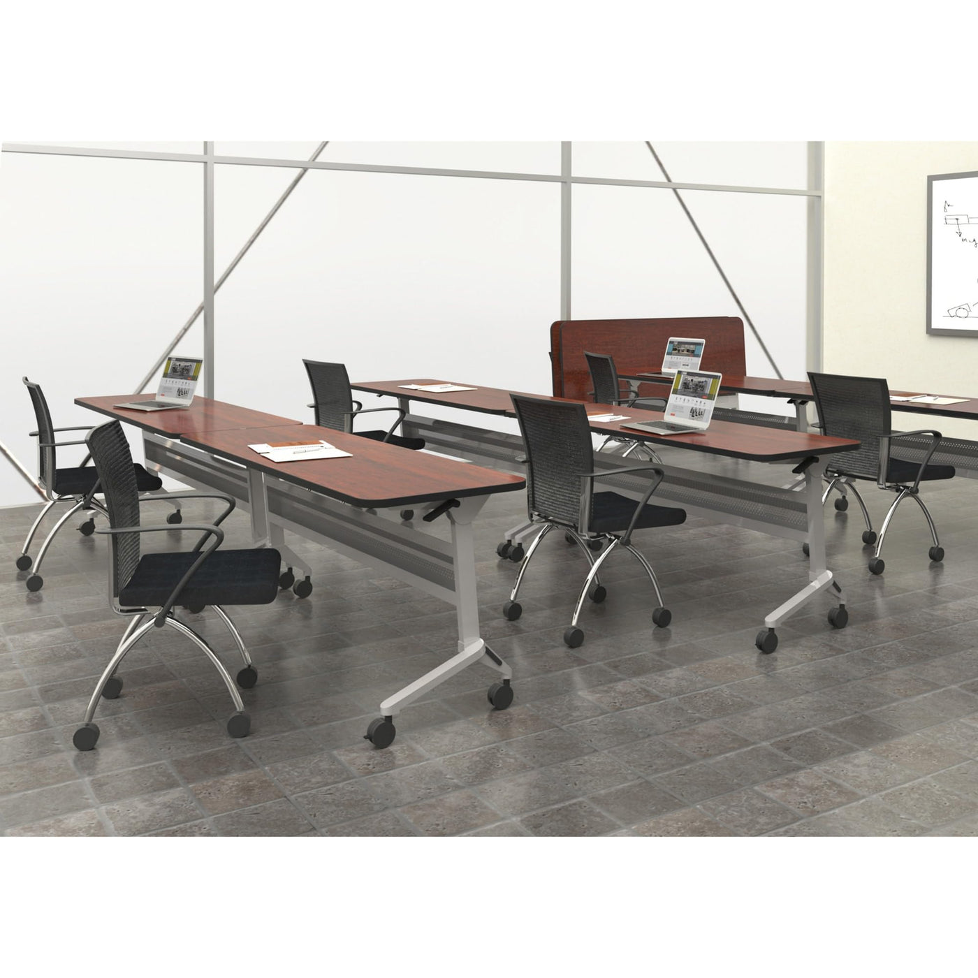 Tabletop Is Part Of The Safco-Mayline Flip-N-Go Training Table That Is Easy To Move And Easy To Store. Once Assembled, The Timesaving Workhorse Nests Neatly For Storage And Holds Up To 150 Lb., Evenly Distributed. Dual-Sided Levers On The Base Flip Tabletop From Horizontal To Vertical. This Tabletop Features Thermally Fused Mahogany Laminate With Standard, Black T-Mold Edges. Use It With Safco-Mayline Flip-N-Go Black Or Silver Steel Frame Bases With Modesty Panel, Built-In Cable Trough And Four Locking Casters. Bases Are Sold Separately. Tables Can Be Connected Together By Using The Included Ganging Kit. Overall Table Height Is 29". The Space Between Tables Is 5-1/4" When Nested.