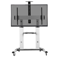 Fits 32' To 100' TV's - Compatible with most 32' to 100' screens weighing up to 220 lbs with VESA patterns of 200x200, 300x200, 300x300, 400x200, 400x300, 400x400, 600x400, 800x400, or 1000x600mm. Holds most LCD, LED, OLED, 4K, Smart, Outdoor, Flat, and Curved TV types. | Mobile Floor Cart - The 45” x 27.5” base features 4 locking casters to make the cart stationary or mobile when desired. The sturdy middle shelf holds laptops, DVD players, streaming devices, and more. High-grade steel and aluminum combined with dual pillar support keeps your equipment safe and secure. | Tilt & Height Adjustment - Enjoy the best viewing angles and reduce screen glare with +5° to -10° tilt and height adjustment from 48” to 68”. Integrated cable management gives the whole display a clean and organized appearance. | Installation - Hardware is provided and we’ve created written and video instructions to help get your TV mounted in no time. | Warranty and Support - This TV cart is backed with a 3 Year Manufacturer Warranty and knowledgeable US-based tech support to help with any questions or concerns.
