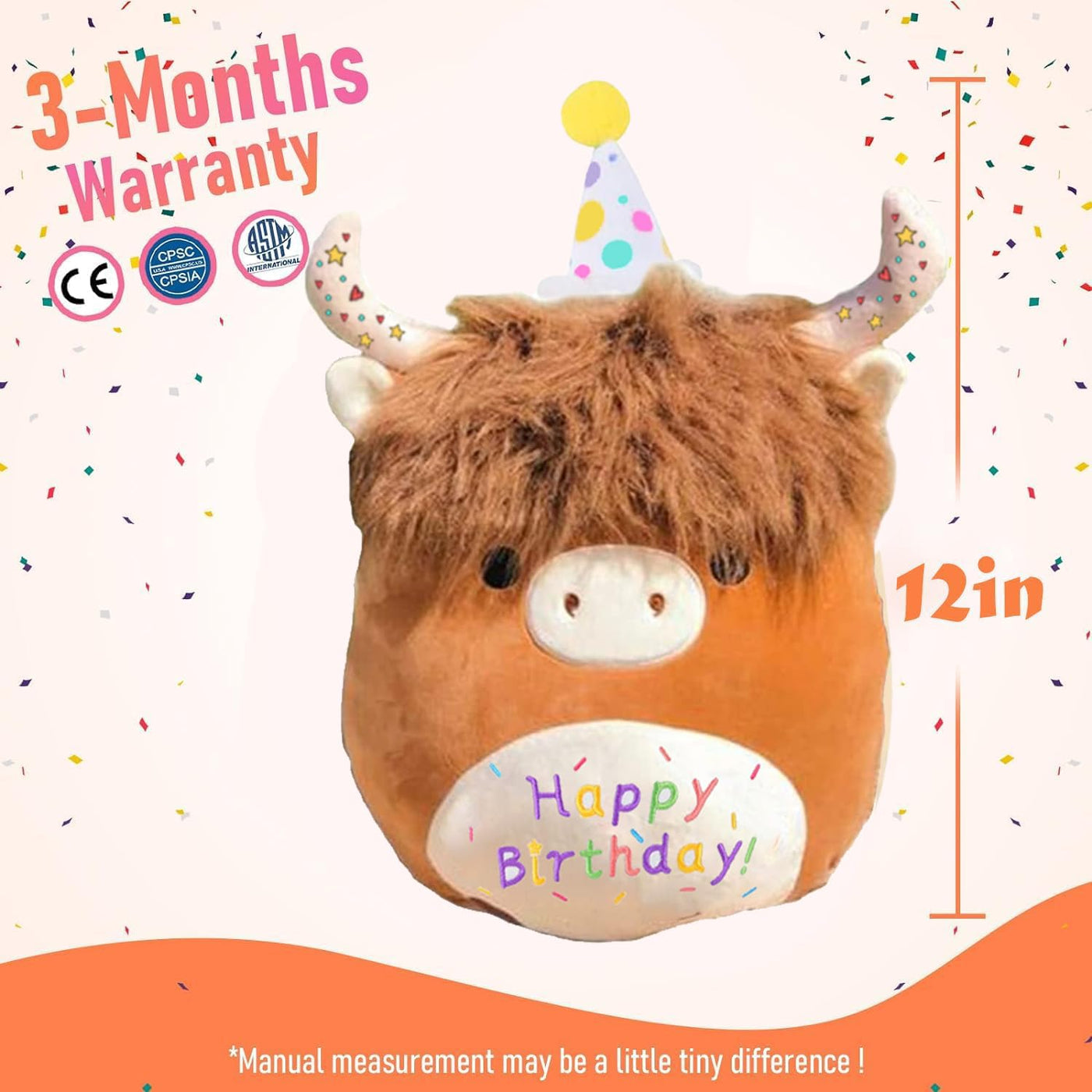 Q: What size is the Happy Birthday Highland Cow Plush Toy?A: The Happy Birthday Highland Cow Plush Toy measures 12 inches, making it the perfect size for cuddling and gifting.