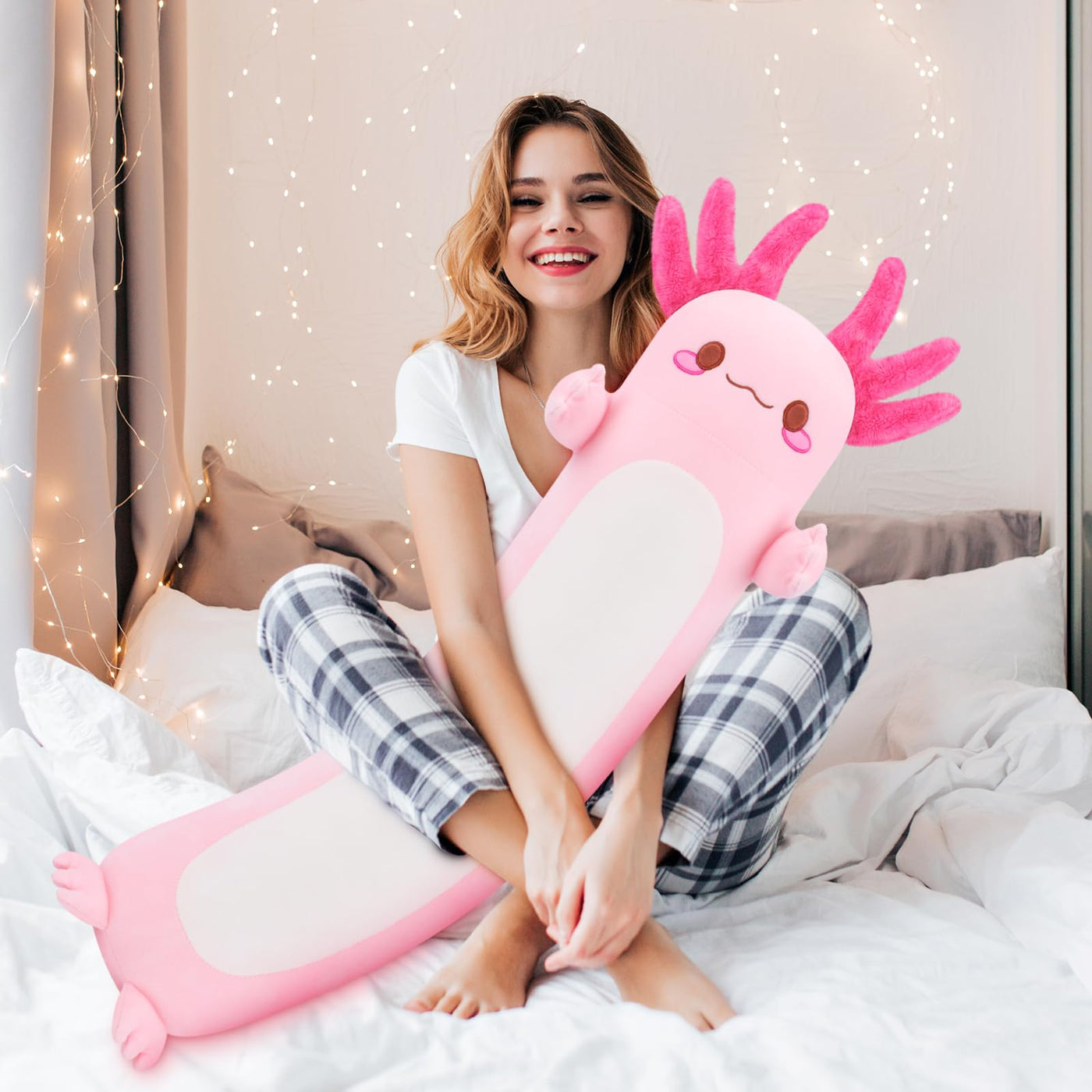 Auspicious Beginning 35.4Inch Cute Axolotl Stuffed Animal Plush Pillow, Soft Kawaii Cat Face Newt Plush Toy Body Pillow Gifts (P
